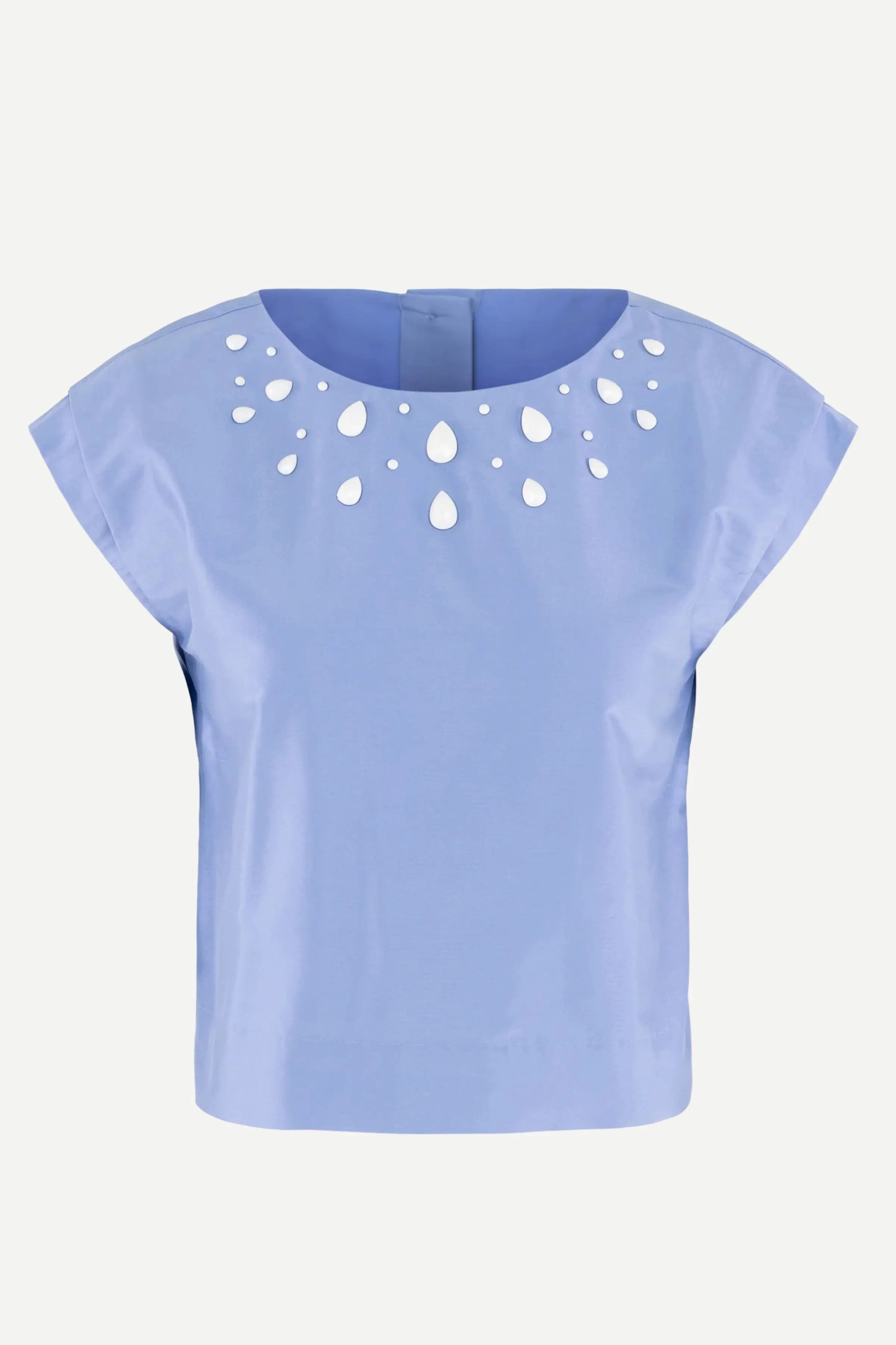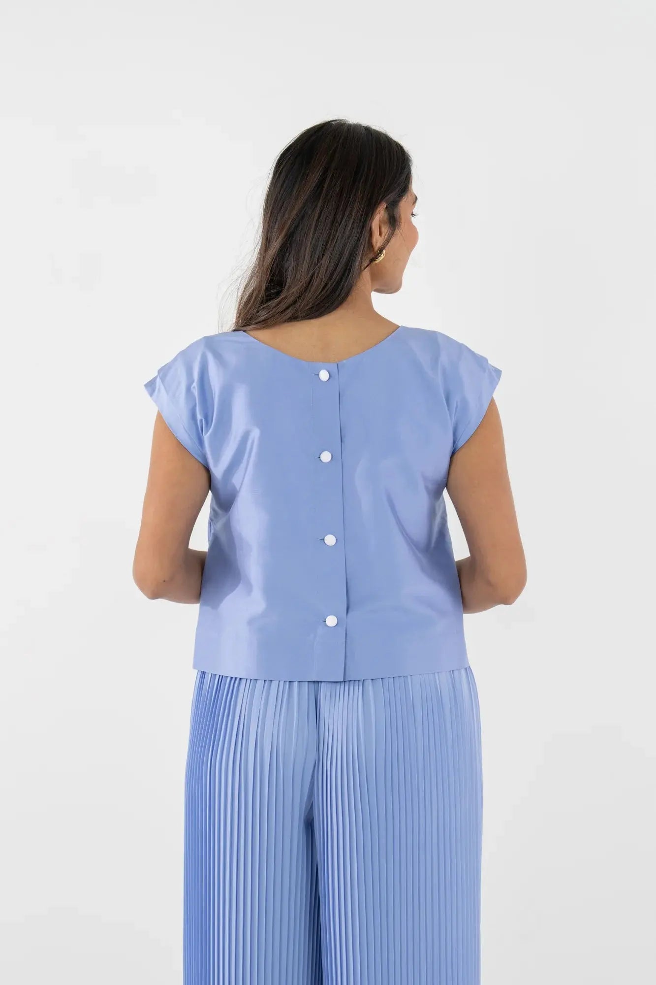 Round neckline Padded shoulder cap sleeves Back button closure Loose fitting silhouette 100% Silk Lining: 100% Polyester