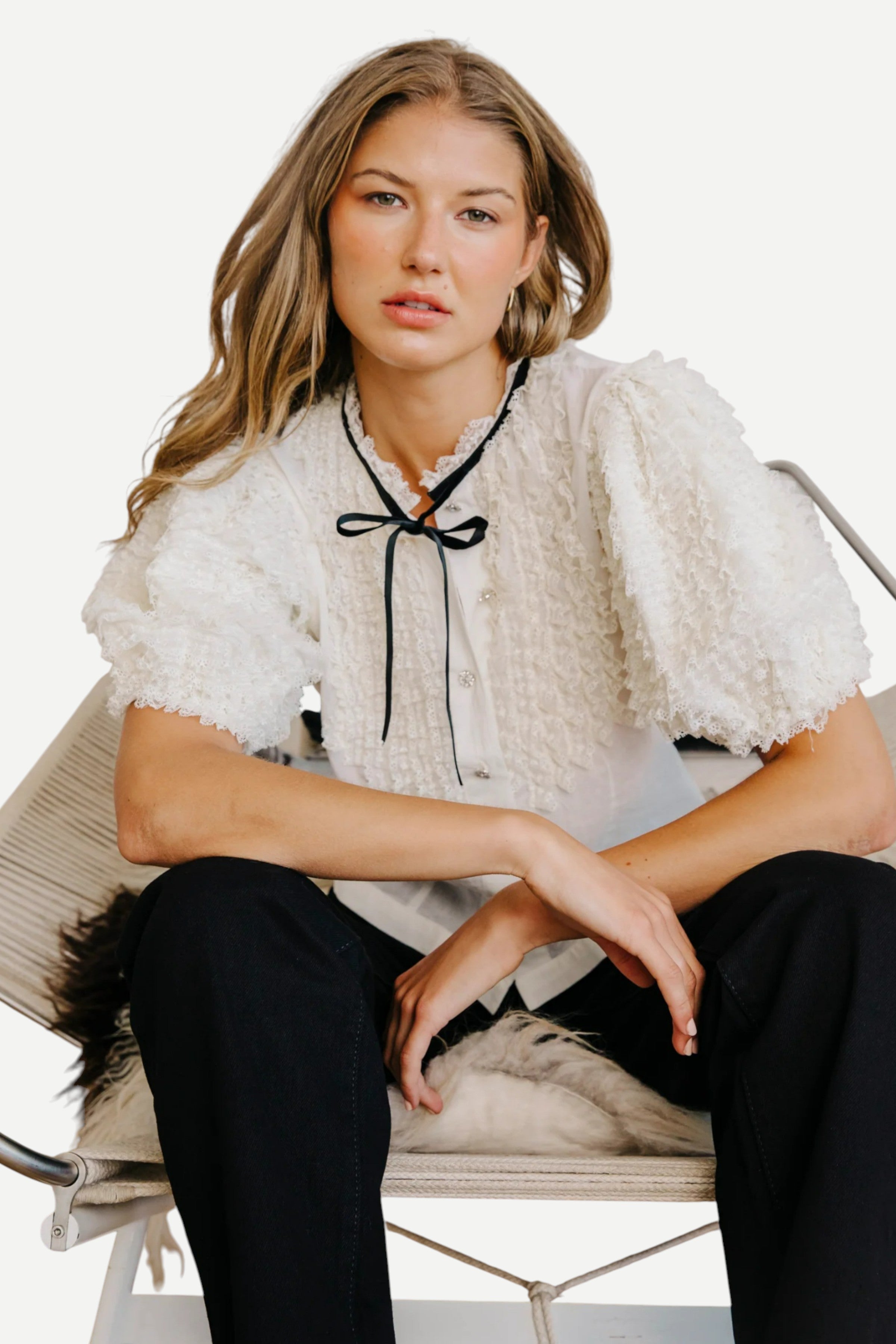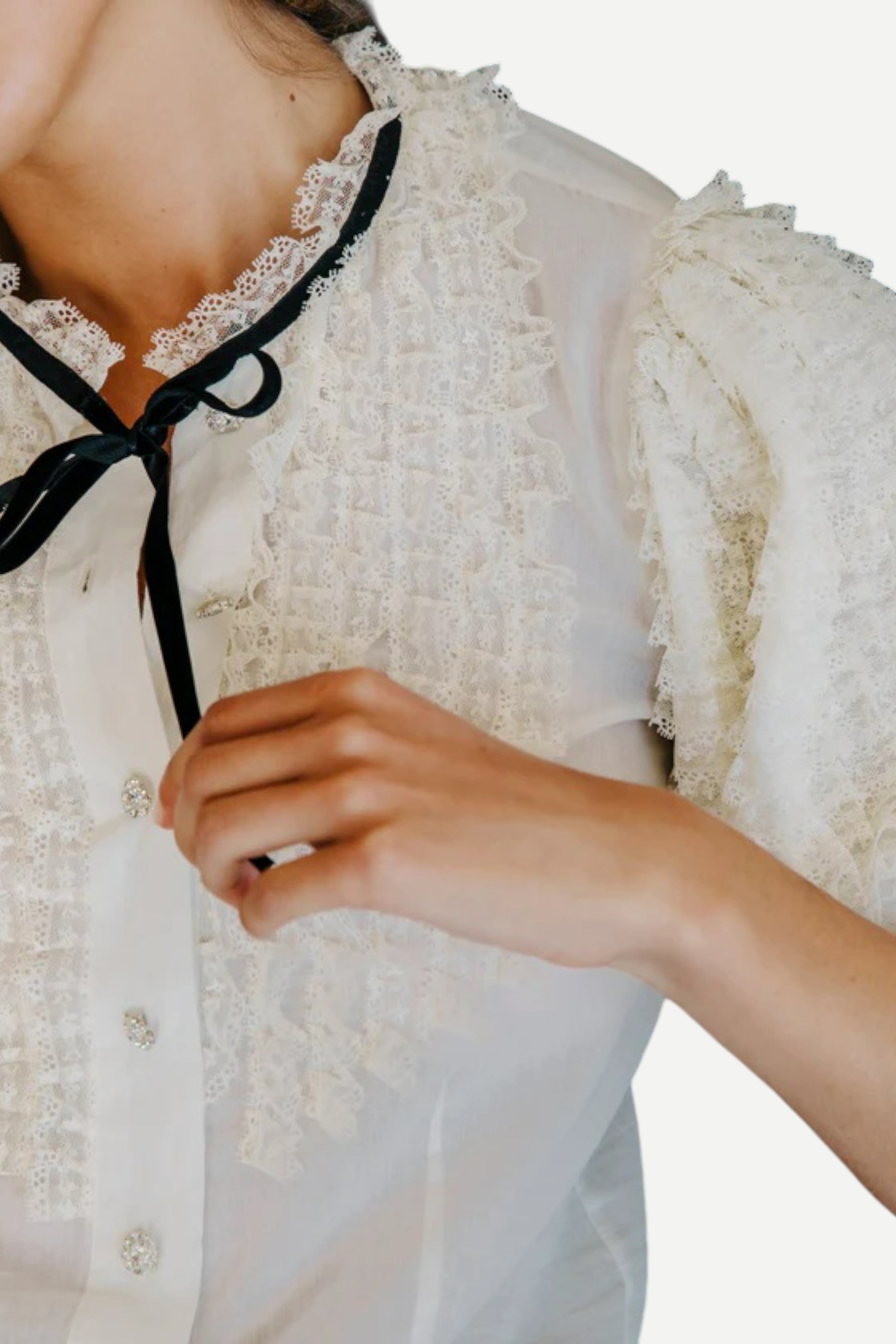 • A romantic blouse with lace trim ruffle detailed sleeves, crystal buttons, and a dainty black velvet tie-neck detail—perfect for effortlessly polished styling.