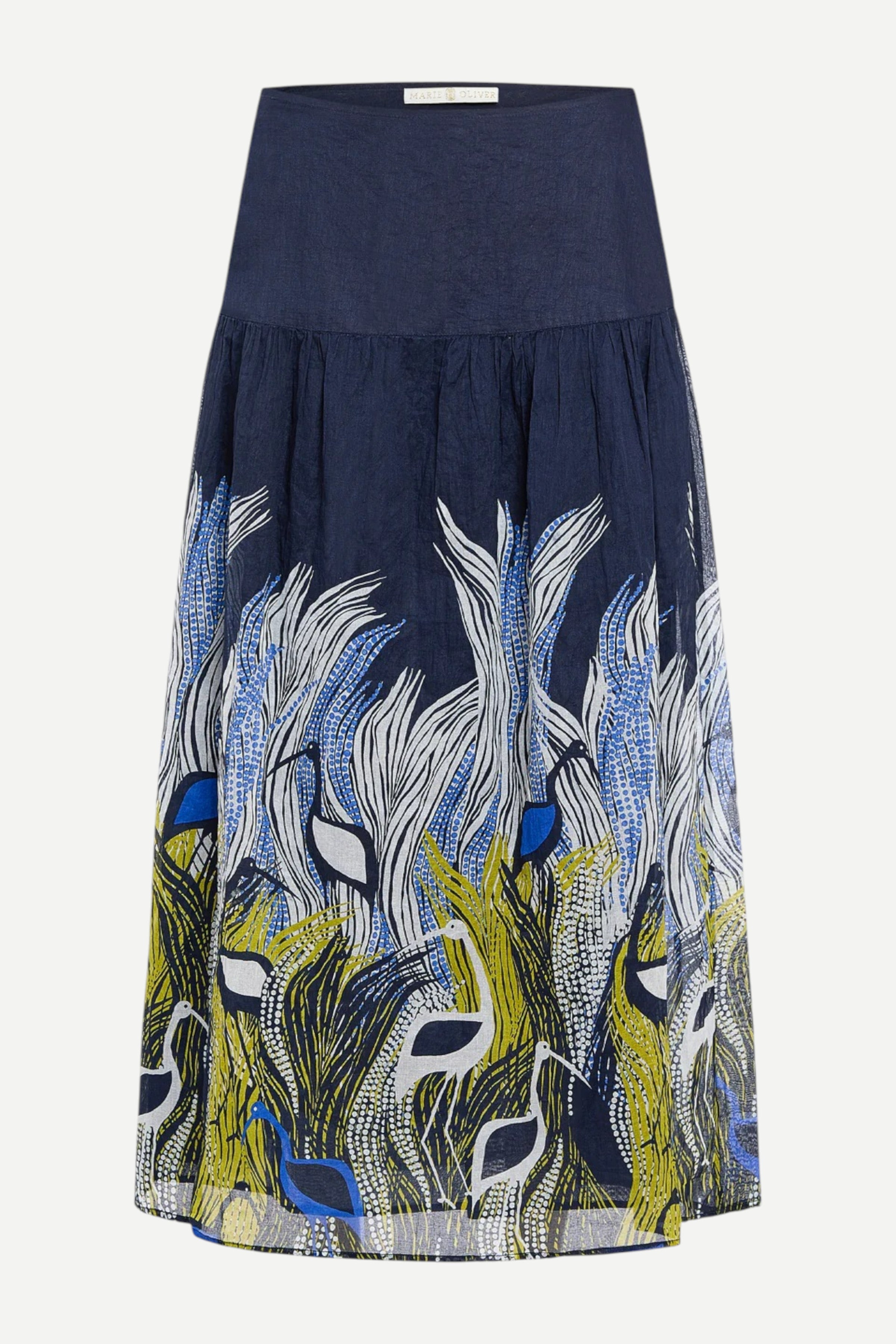 A refined drop waist and subtle texture define the midi-length Owens skirt, creating an elevated foundation for warm-weather dressing. Together with the matching Estella top, the set is finished in Heron, an abstract avian placement print with chartreuse, cobalt, and white details on navy.