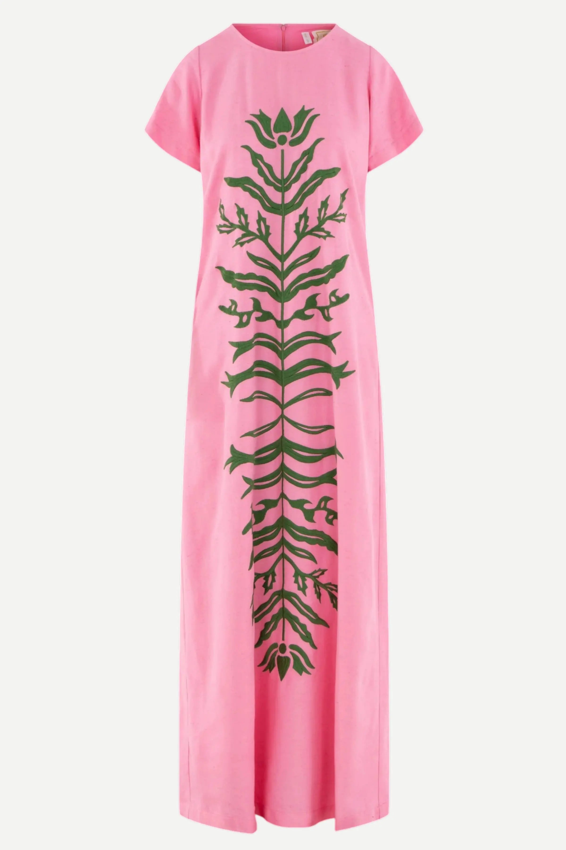 The Cornelia Dress in Rosé is a classic and foundational silhouette elevated through thoughtful craftsmanship. Designed with a round neckline, classic short sleeves, and a relaxed, flowing shape, it offers effortless polish. A green floral appliqué brings traditional Indian motifs to life, with each stitch adding subtle, artful texture. Romantic and refined, this piece feels both heirloom and modern—a true celebration of quiet detail and design.