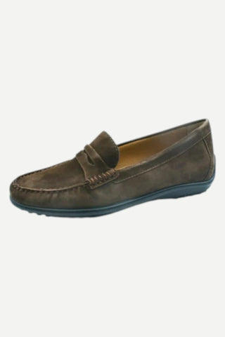 Bibi Lou Ballerina Suede Flat, Dark Camel Tan w/ Silver Bubble Studs