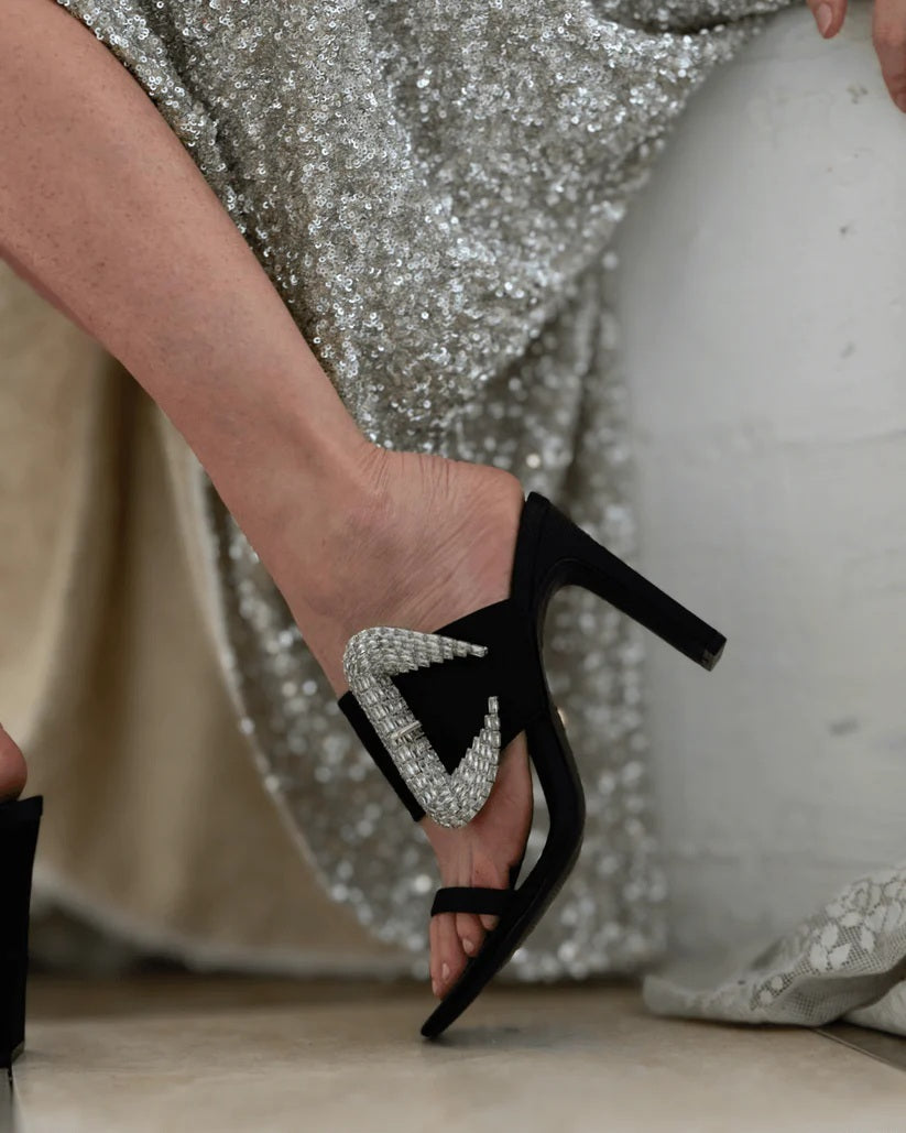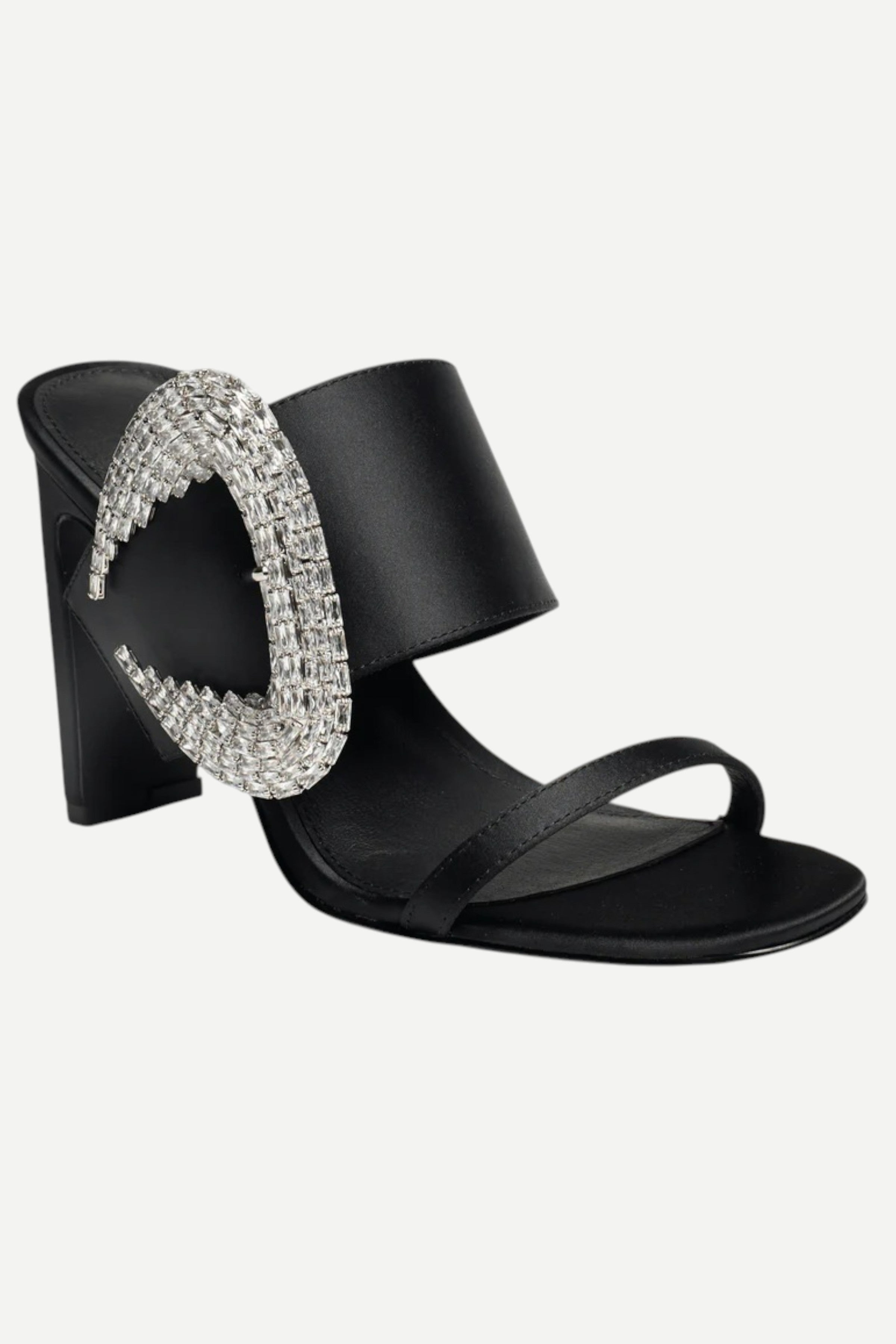 A sparkly, oversized buckle add a touch of glamour to the thick vamp strap atop this elegant satin sandal elevated by a tapered heel.