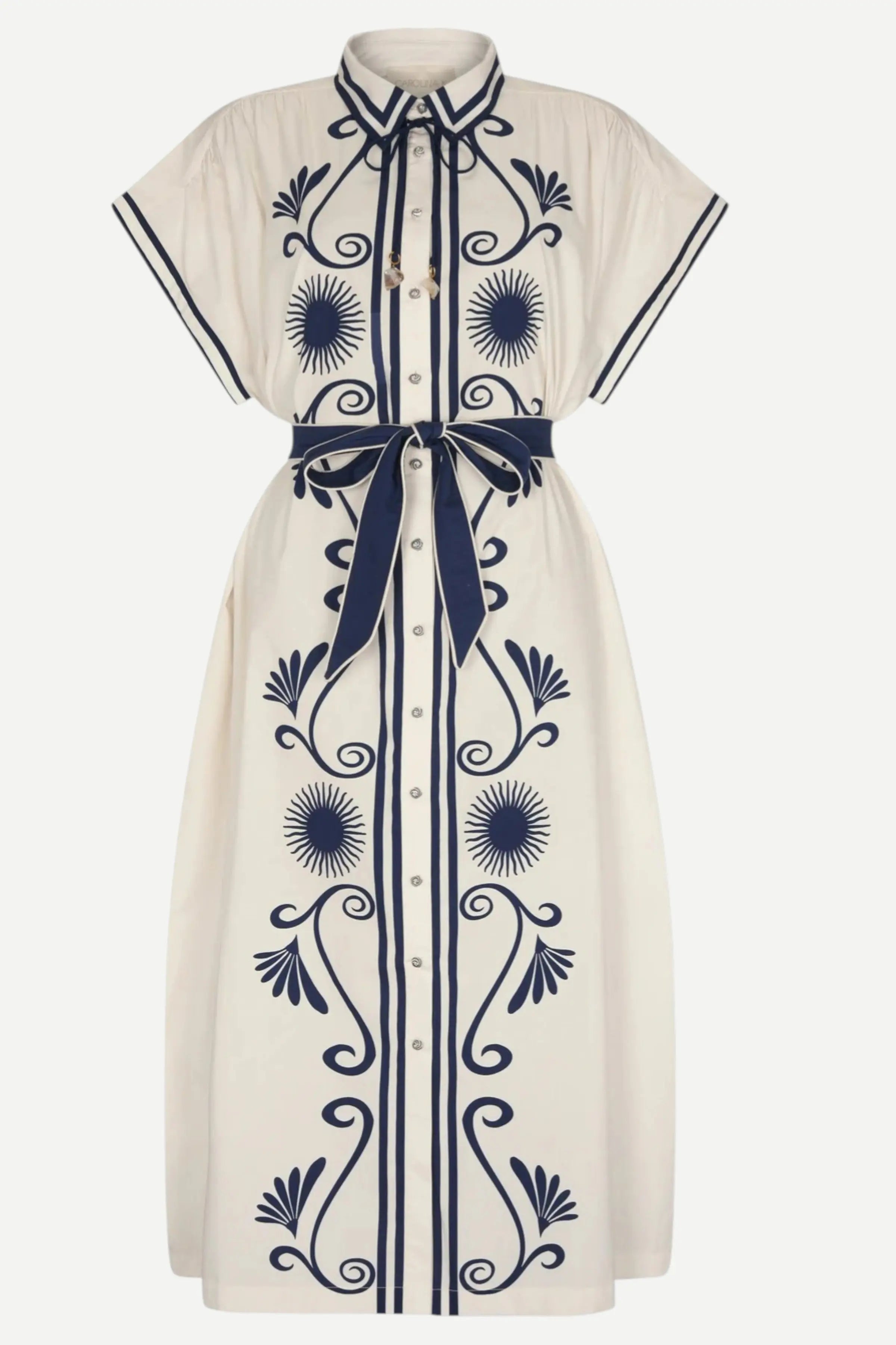 Ivory midi dress with navy blue printed pattern