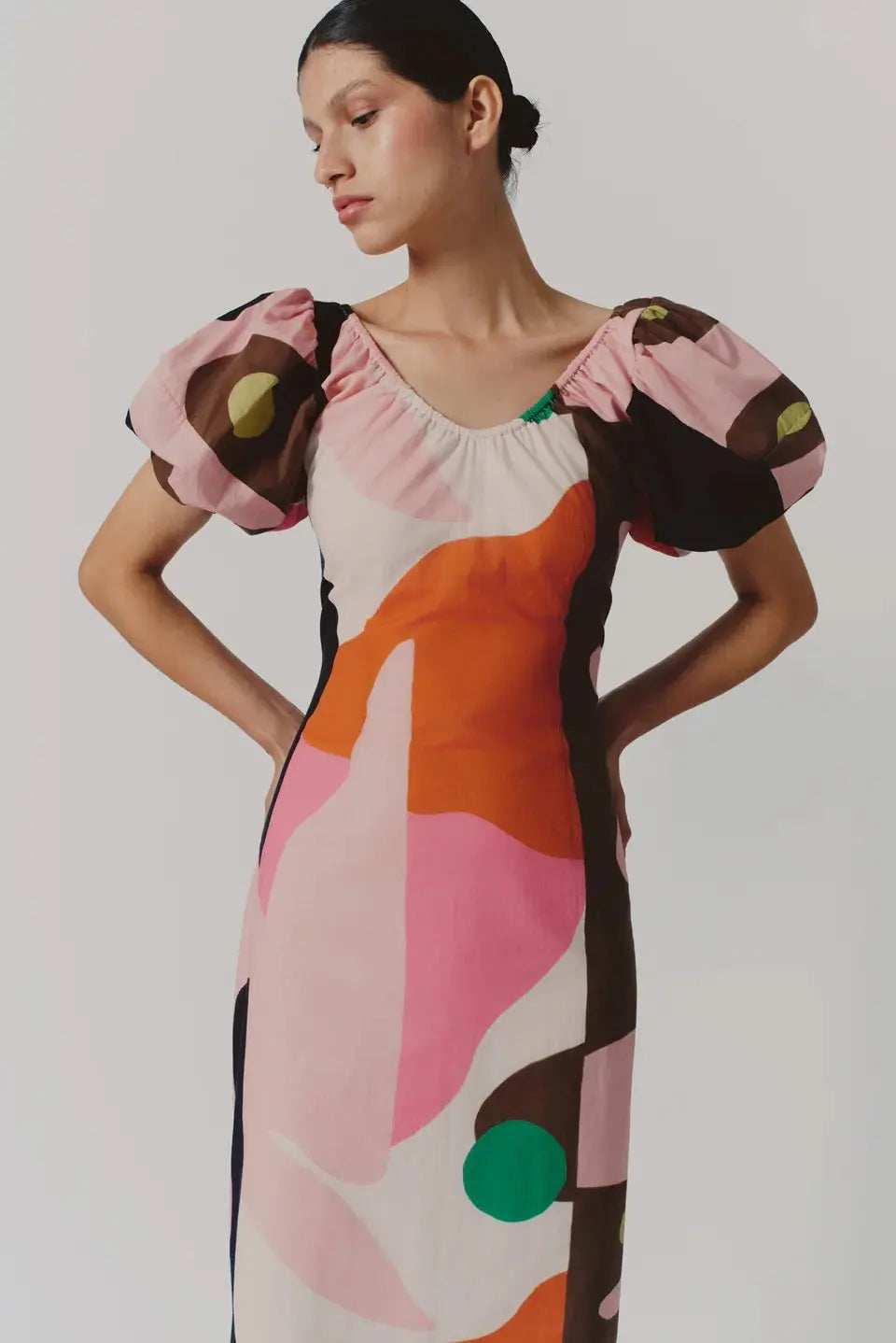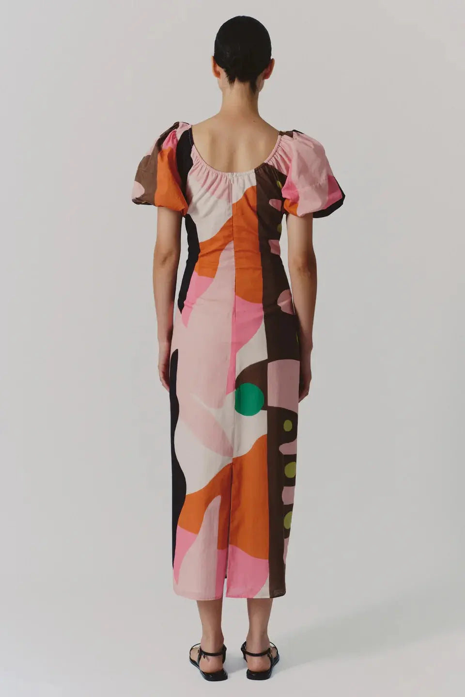 Abstract Print Puff Sleeve Midi Dress – Artistic Modern Statement Dress