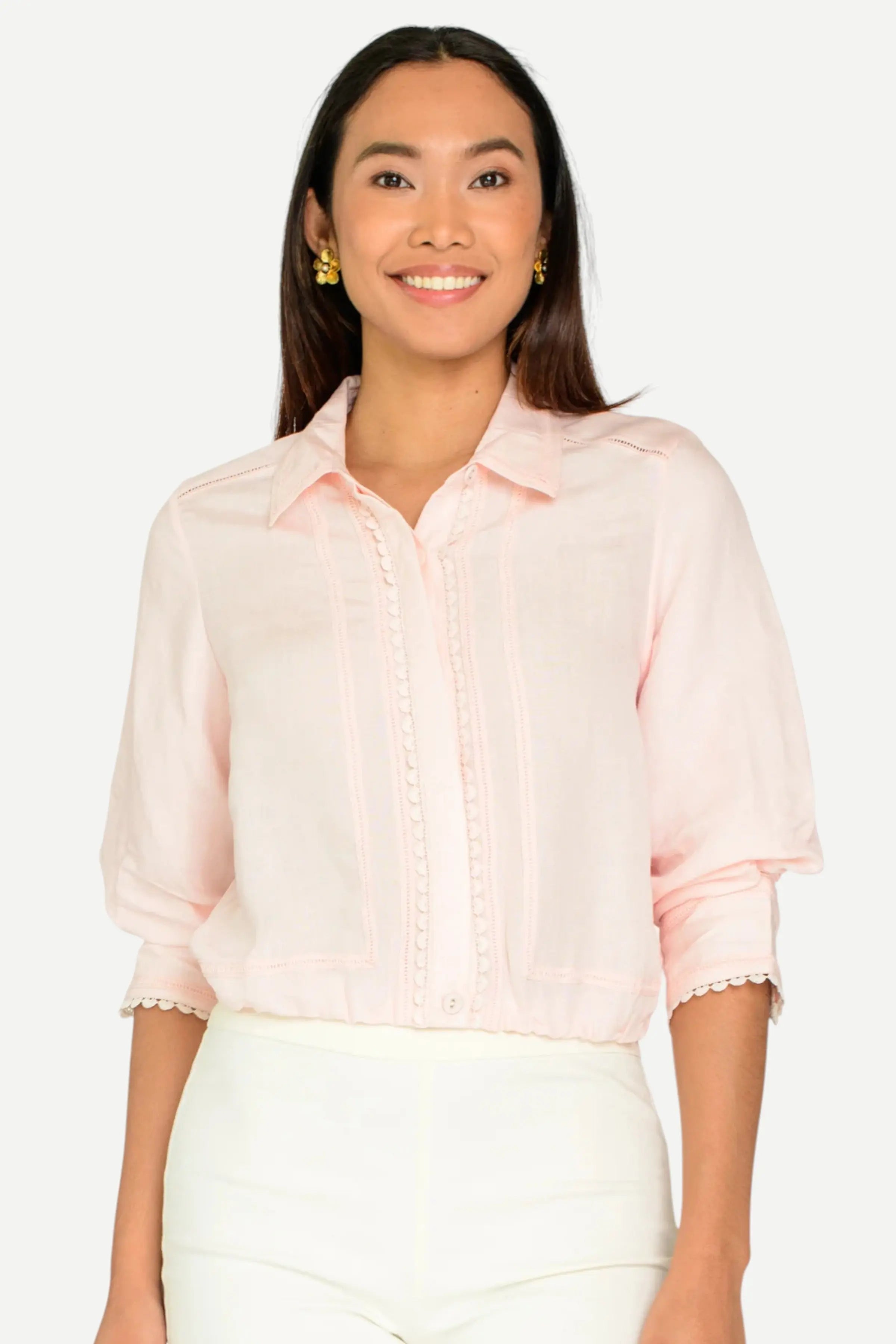 The Carter Top is a chic, waist-length button down with an elastic waistband and fun gathered sleeves. She lays perfectly with your favorite pants or skirts, providing full stomach coverage while avoiding a bulky tuck. Swap out a pair of high waisted pants for a fun skirt to bring this top from day to night.