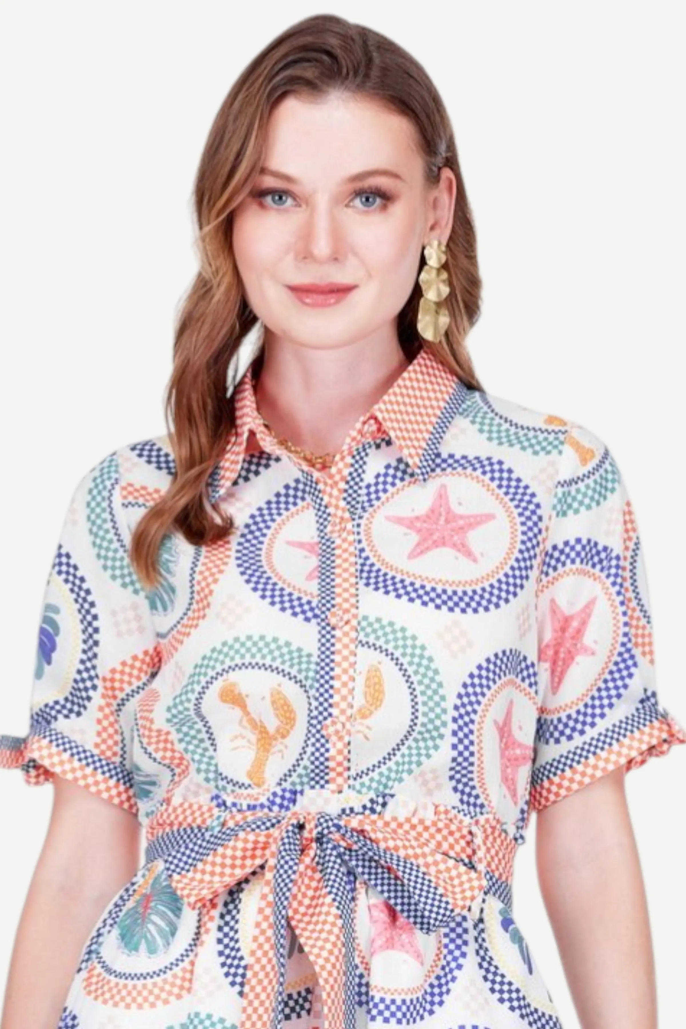 Lightweight Cotton Button Down Blouse. Small tie on sleeve.