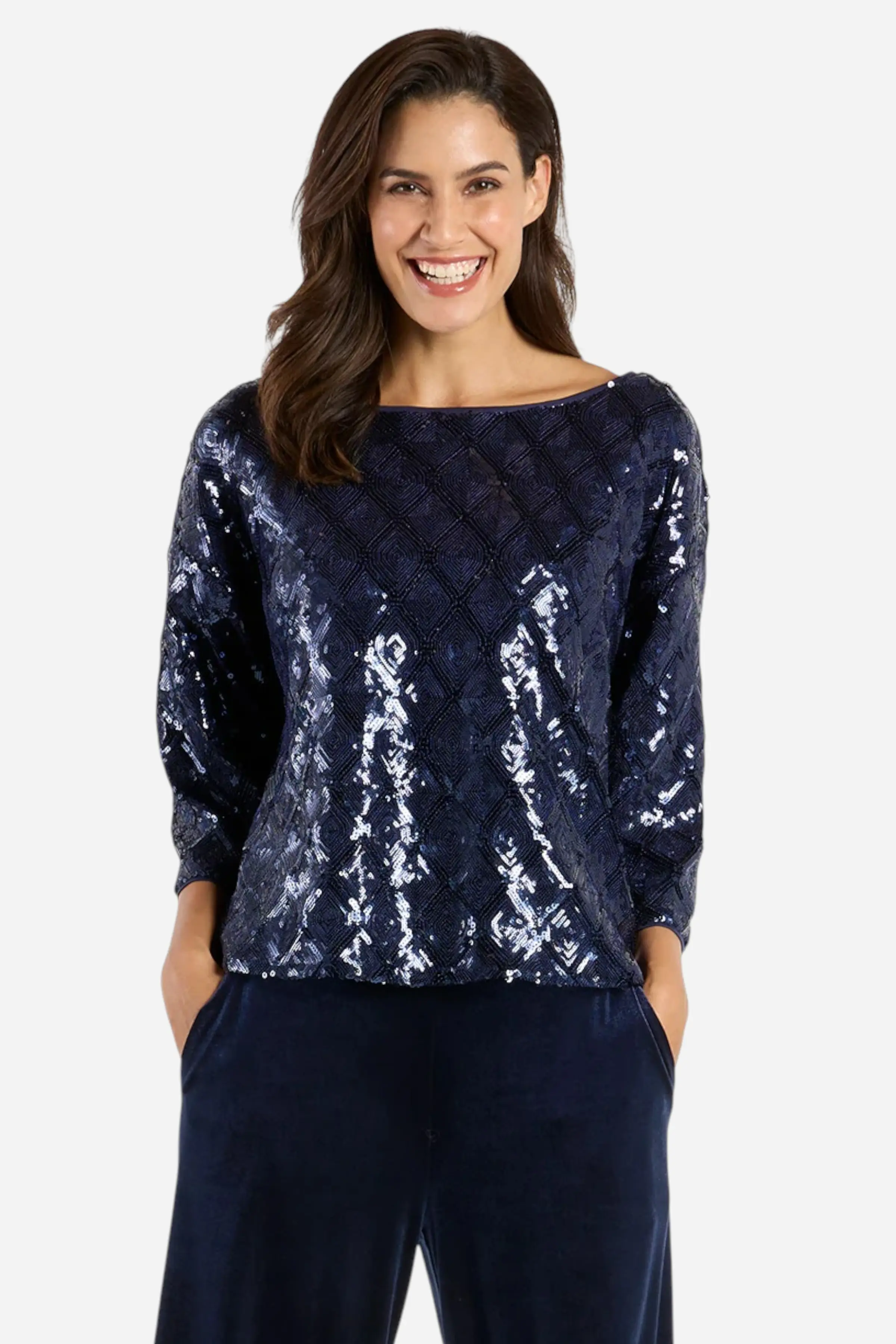 Meet Dora! A chic and effortless pullover top featuring a flattering bateau neckline and 3/4 sleeves. Crafted from elegant sequins, this versatile adds just the right amount of sparkle making it perfect for any occasion. A timeless staple you'll reach for again and again!