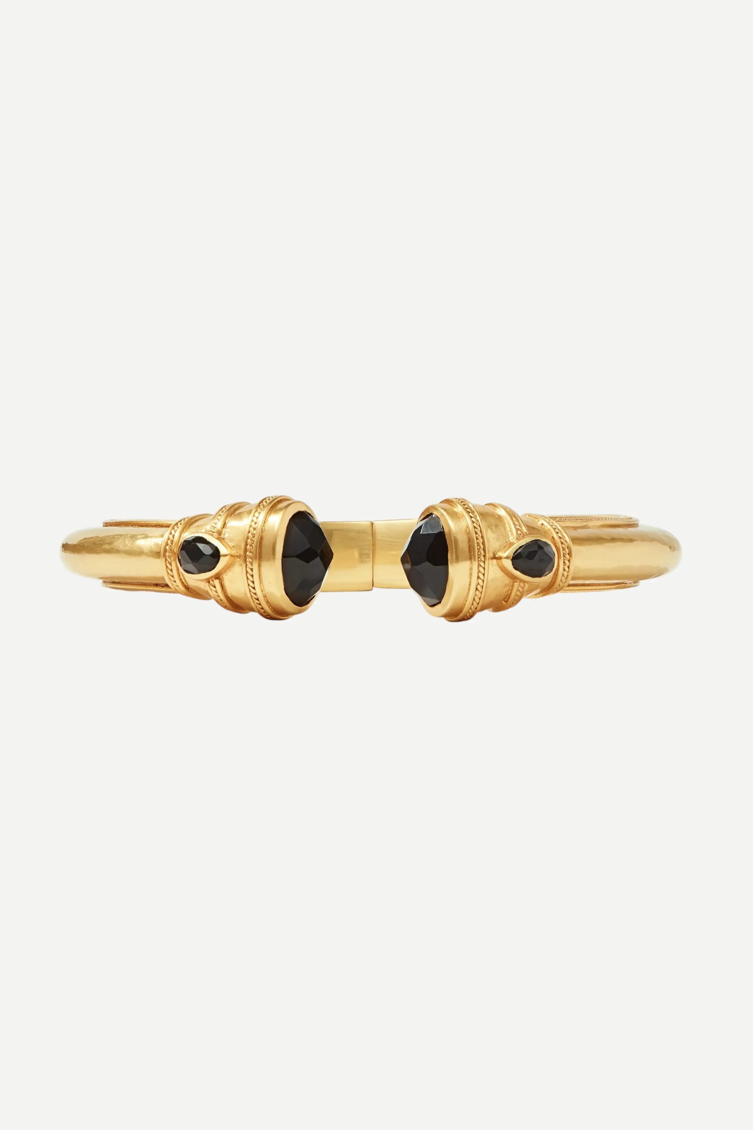 This cuff features gemstone endcaps and two more pear-shaped gemstones set in a luxuriously gilded shank.