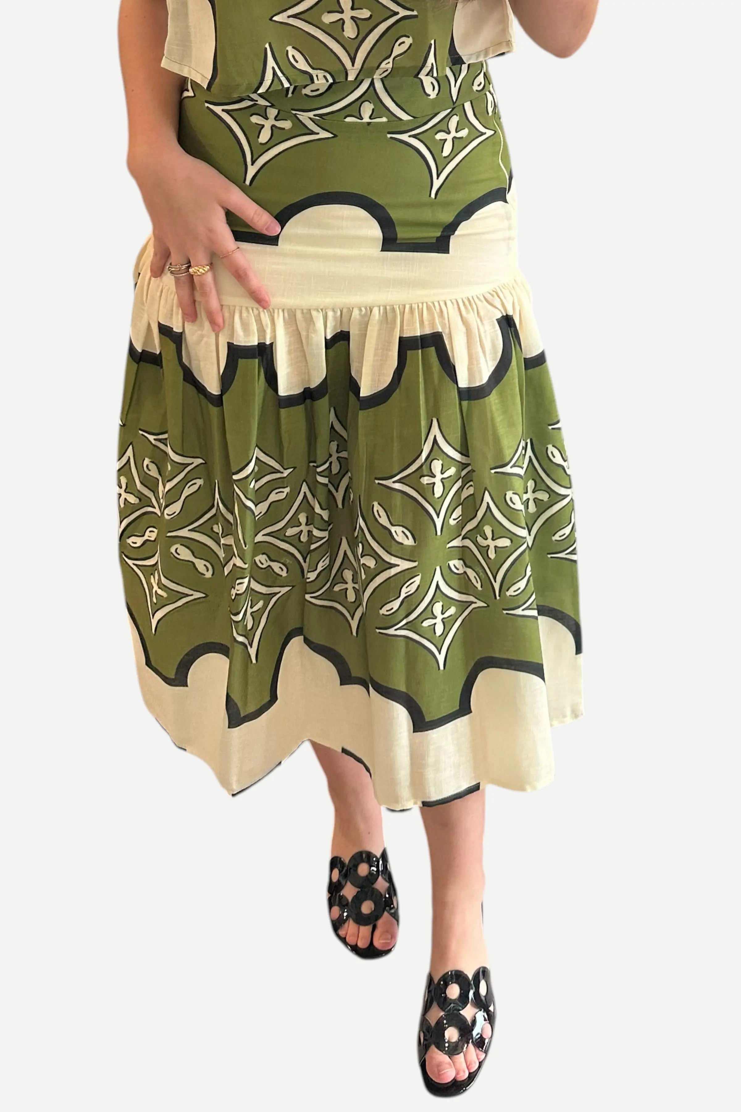 The LAVI Zoe Skirt features a linen drop hem design, providing a lightweight and breathable option suitable for warmer climates. Its lining enhances comfort against the skin, while the tailored fit caters to those preferring a snug silhouette. Note that this garment runs small, ensuring a precise fit for optimal wear.