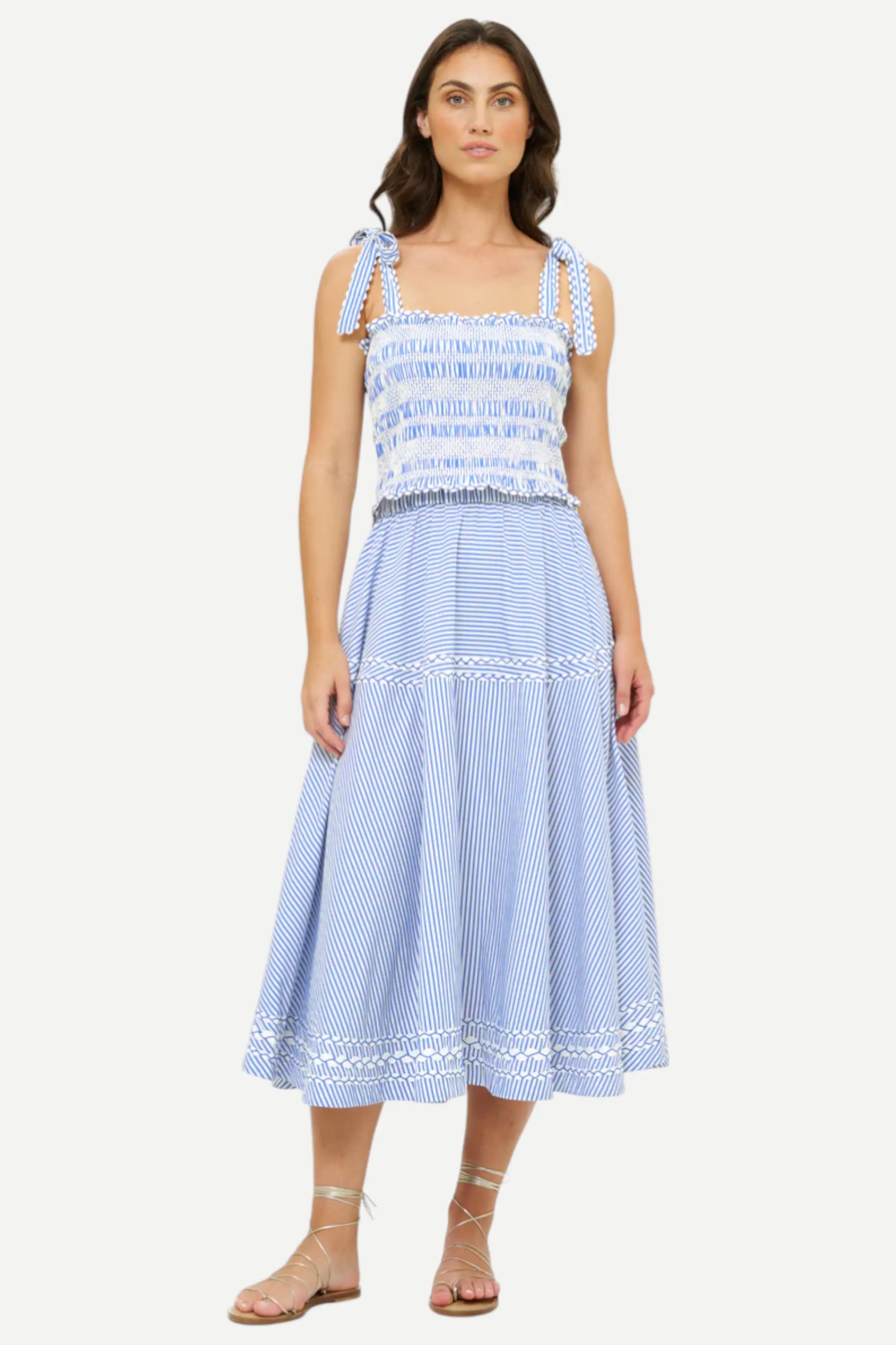 A sophisticated nod to heritage maritime style and crisp coastal tailoring.The Sconset Blue Oliva Skirt balances architectural precision with the romantic spirit of a Mediterranean escape.Envisioned for a life of polished seaside lunches and yacht-side gatherings,this silhouette captures a vision of effortless purity and elevated ease.
