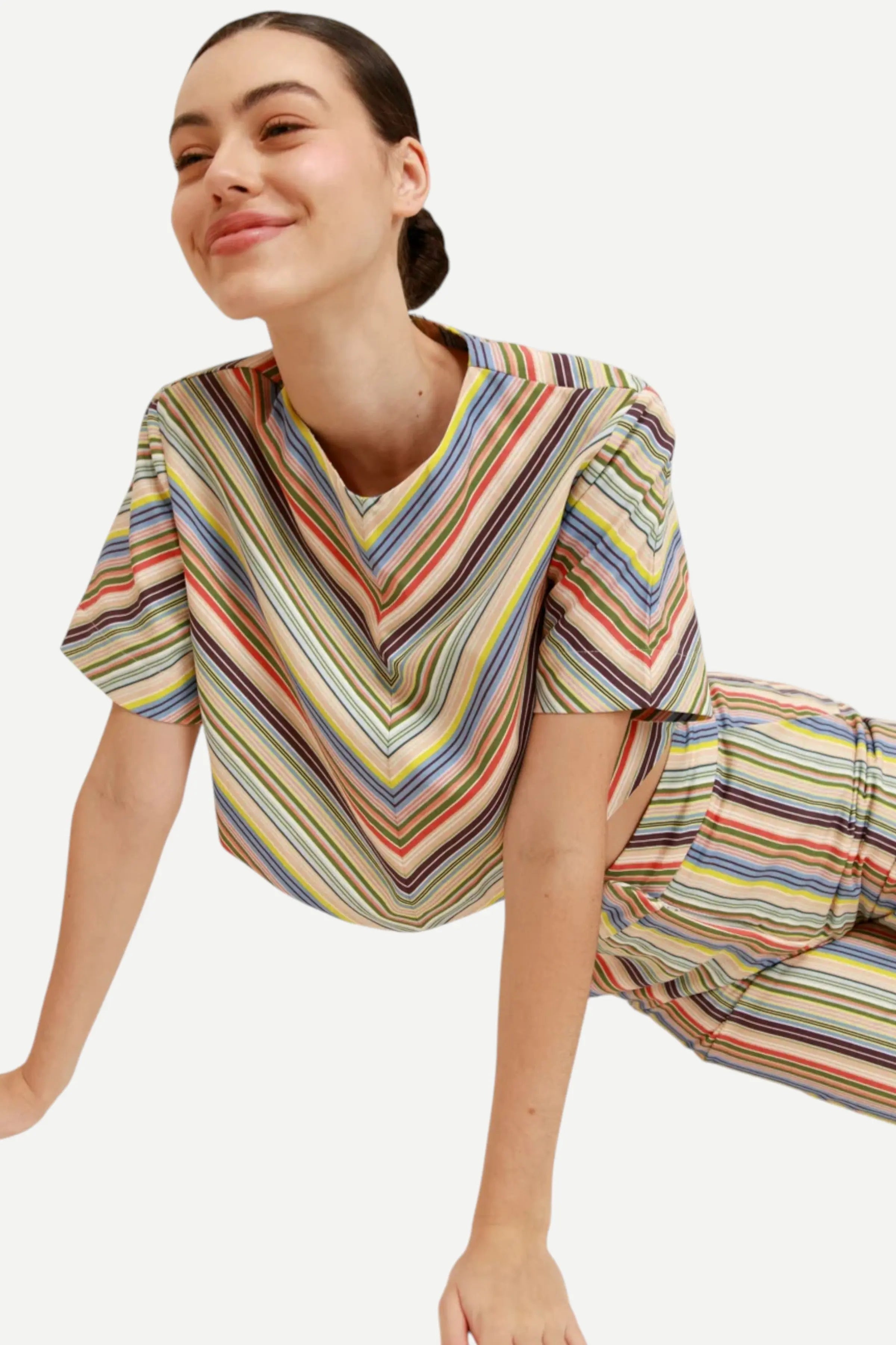 This straight-cut women’s shirt features a classic pointed collar and bold chevron stripe pattern for a modern, tailored look. Designed for effortless style and all-day comfort, it’s the kind of statement blouse you put on and instantly feel confident in.