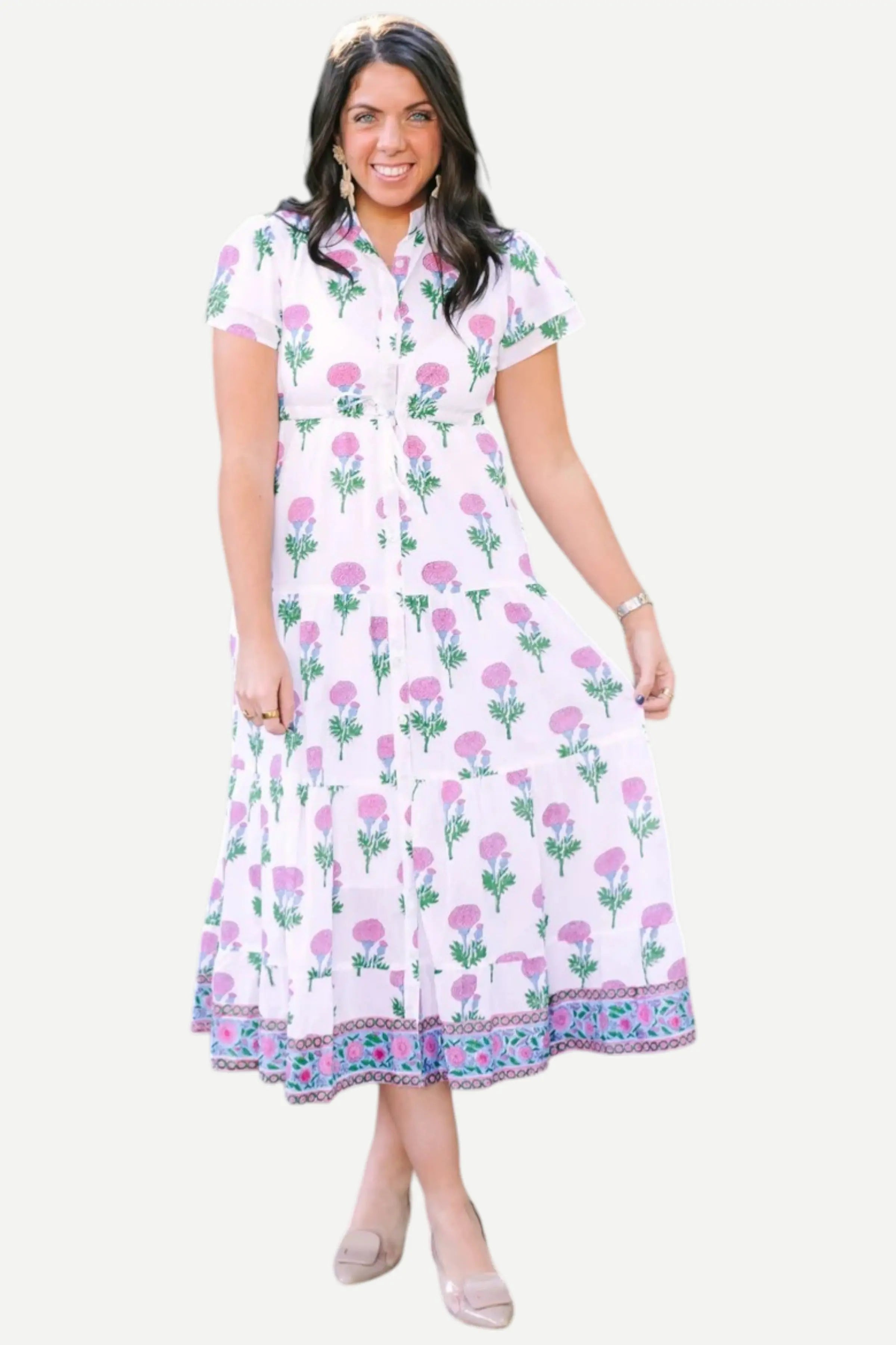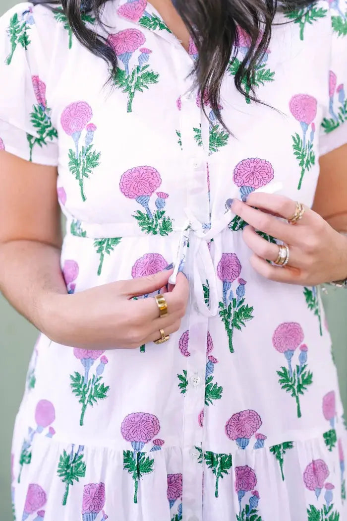 Our Magnolia Flutter Dress was designed after Magnolia Gardens in Charleston. It features a drawstring waist, four-tiered skirts, top-to-bottom contrasting trim, and buttons going upwards from the bottom of the dress to the bust.