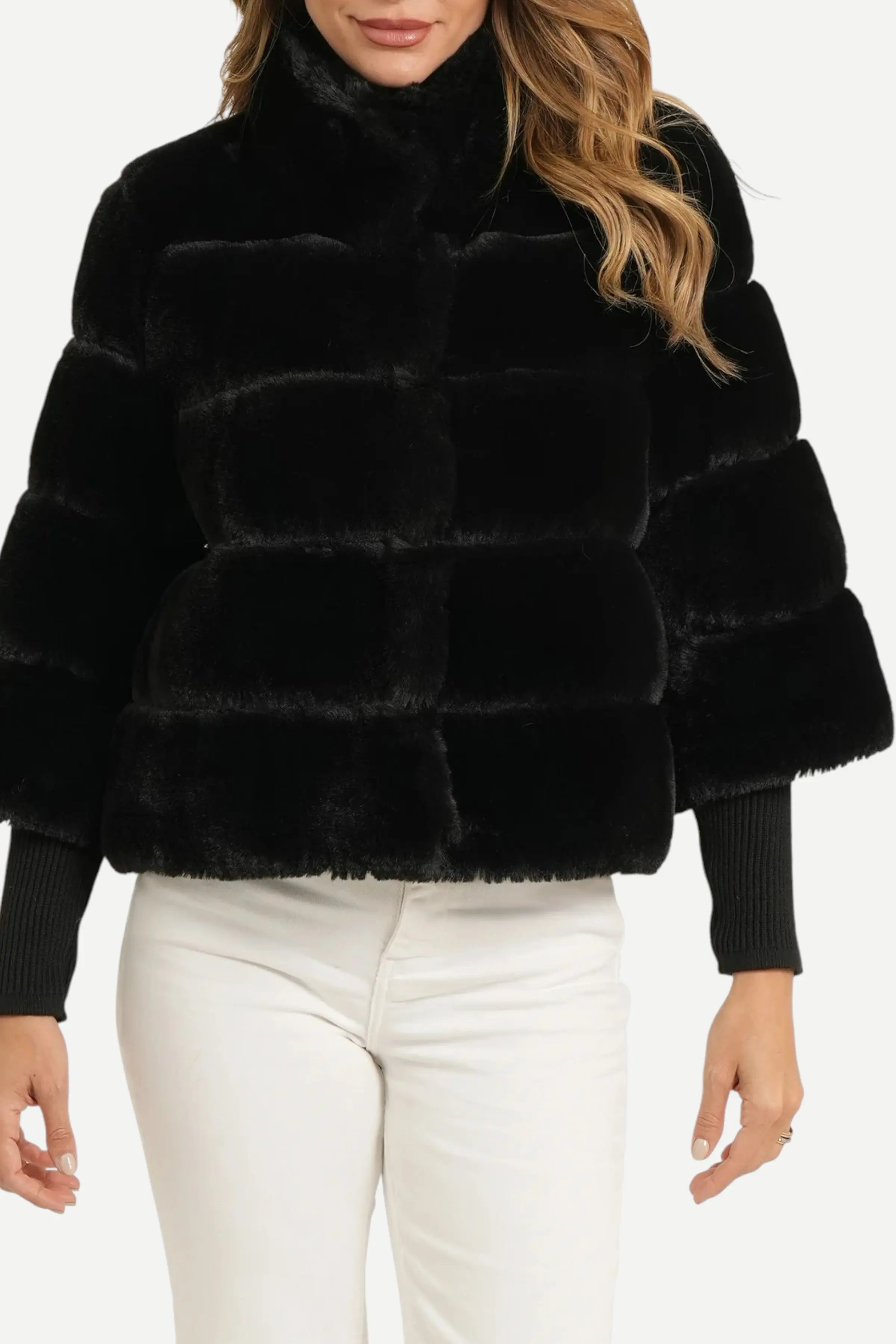 Samantha faux fur paneled jacket, stand collar, snap front closure, front slit pockets, paneled faux fur, ribbed knit sleeve cuff, relaxed fit.