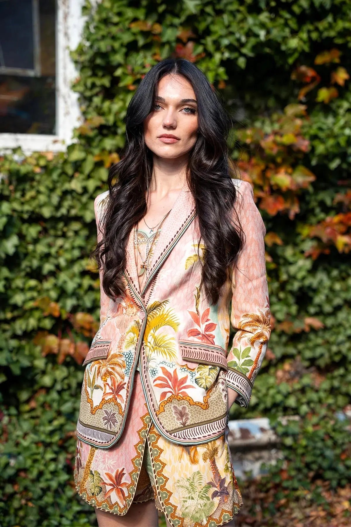 A jacket that frames the body with quiet confidence and visual depth. Crafted in linen viscose, this multi-color piece features the Costa Rica print with layered palm artwork and ornamental borders placed thoughtfully across the surface. Designed with full sleeves and a notch collar that opens into a deep V, highlighted by contrast piping and fine stitch detailing along the edges. The tailored-yet-relaxed fit sits clean on the shoulders and falls fluidly, making it feel structured without feeling stiff.