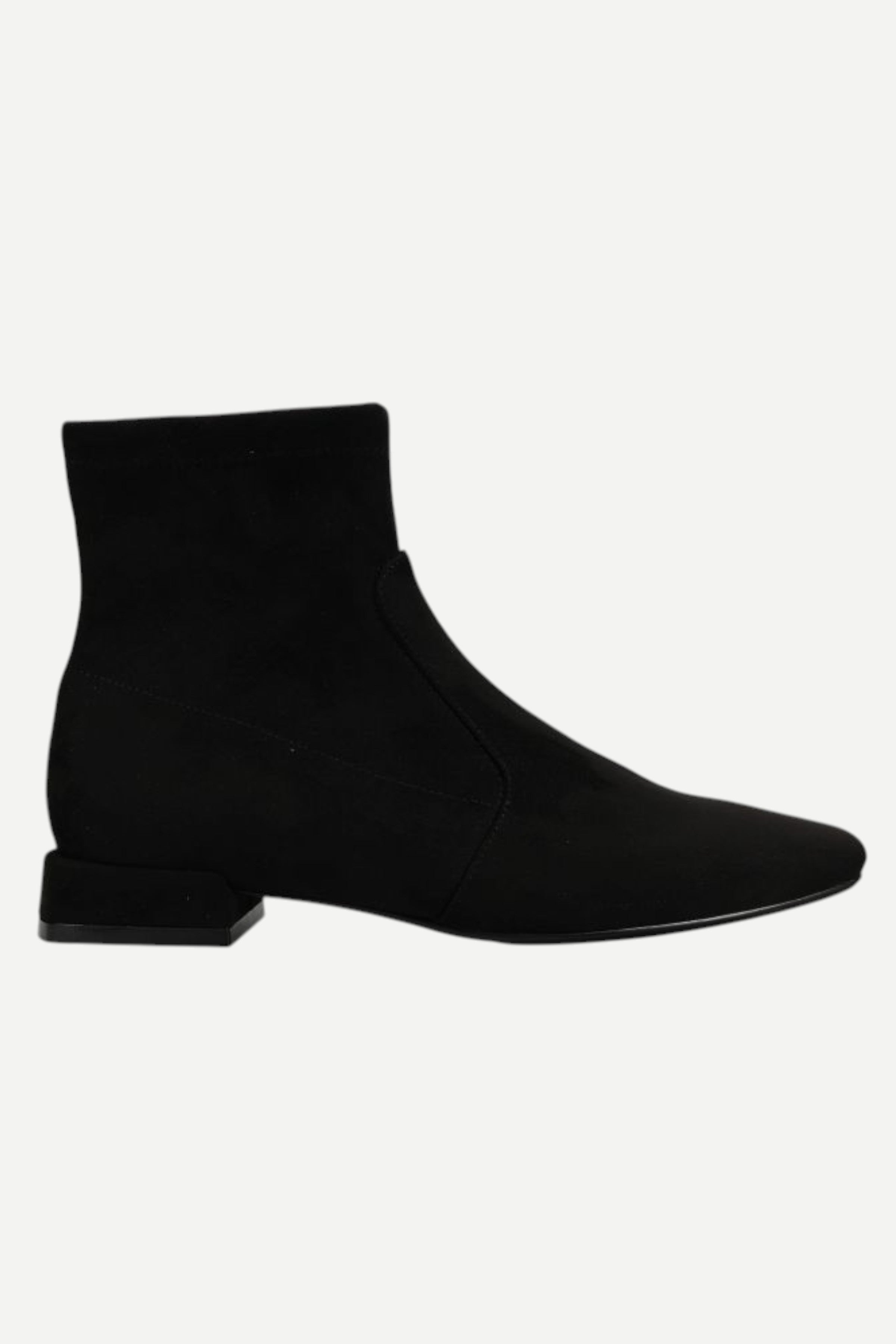 Stretch suede Chelsea boot. Square toe. Side zip. 1 inch covered heel.