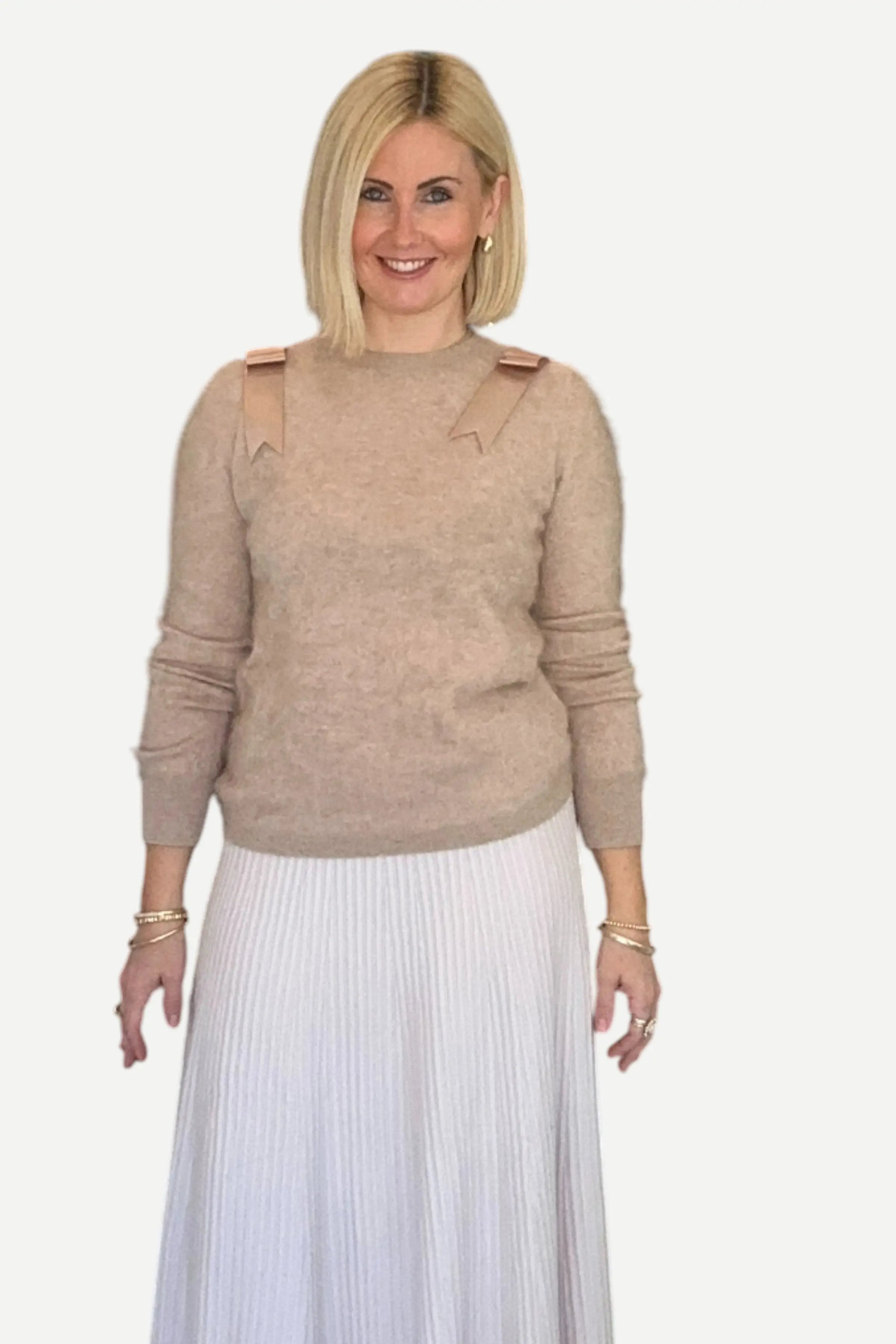 Silk bows accent the top of this fuzzy cashmere sweater. They lay perfectly flat on the top of the shoulders.