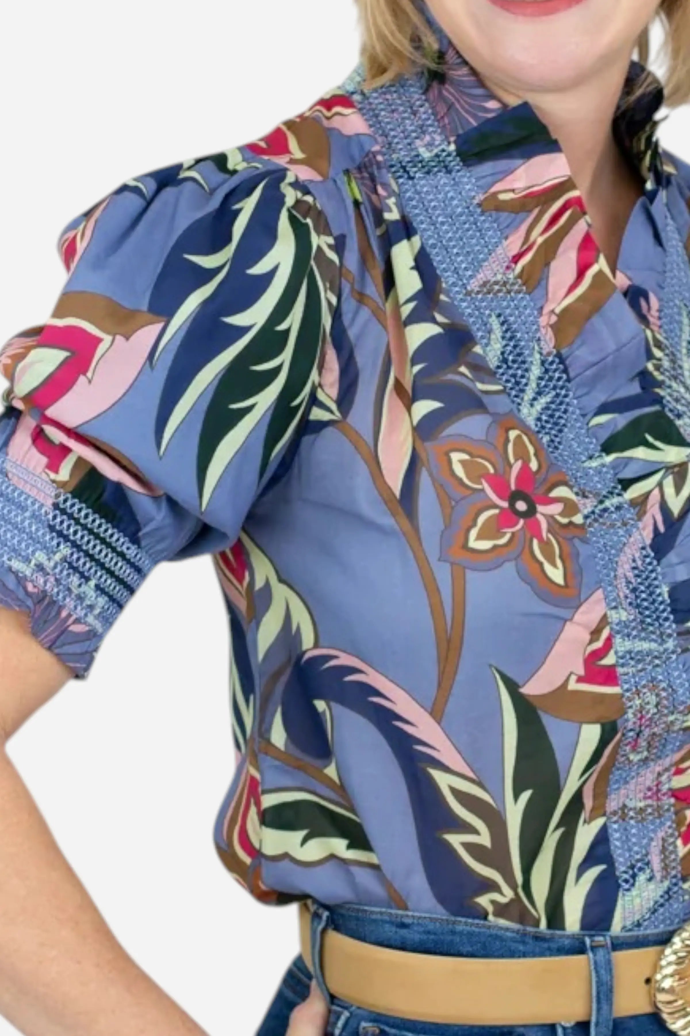 The Love The Label Zuri Top in Waltz of Flowers Print is a charming, feminine blouse that blends romantic details with easy-to-wear style. It features a bold floral pattern, a flattering V-neckline with ruffle and smocked trim, a button-down front, and short puff sleeves with smocked cuffs for a softly structured look. 100% Cotton
