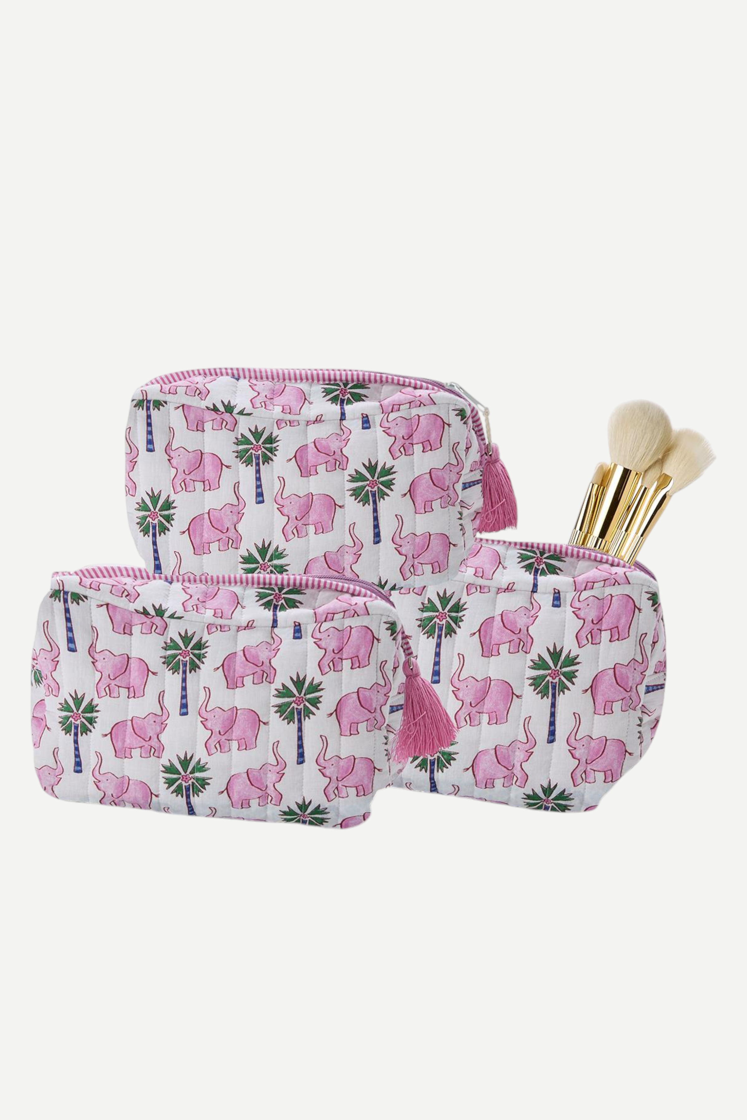 Add a touch of exotic charm to your vanity with our Lucky Elephant Printed Cotton Quilted Cosmetic and Accessory Bags. Crafted from soft cotton and lined with waterproof material, these bags are as practical as they are beautiful.
