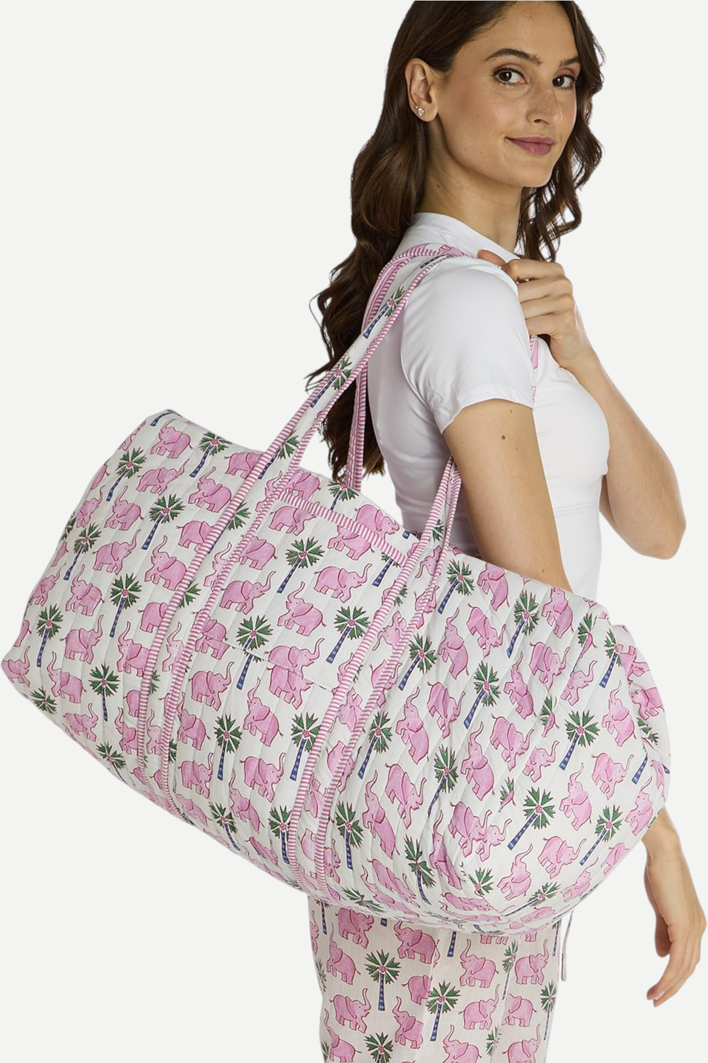 Our Lucky Elephant Printed Cotton Quilted Weekender Bag is crafted from soft, quilted cotton and designed with both fashion and function in mind. Whether you're heading out for a weekend escape or a chic gym session, this spacious carryall has you covered. Featuring a charming Lucky Elephant print, coordinating mini stripe lining, and a secure zip top closure, it's thoughtfully designed to keep you organized on the move.