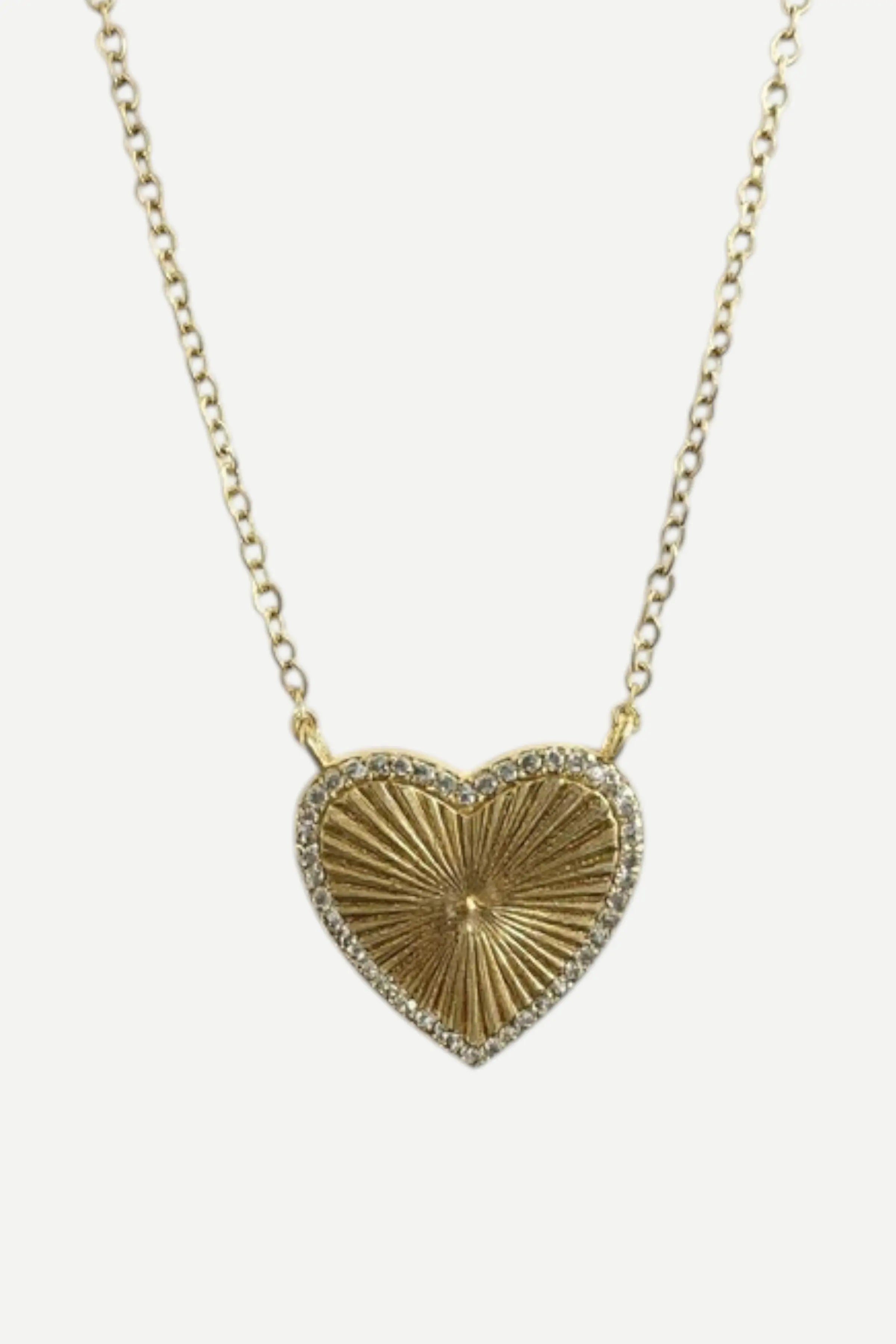 Our Fluted Heart Necklace is heavily 14K Gold Plated over Brass and is adorned with pave Cubic Zirconia diamonds.