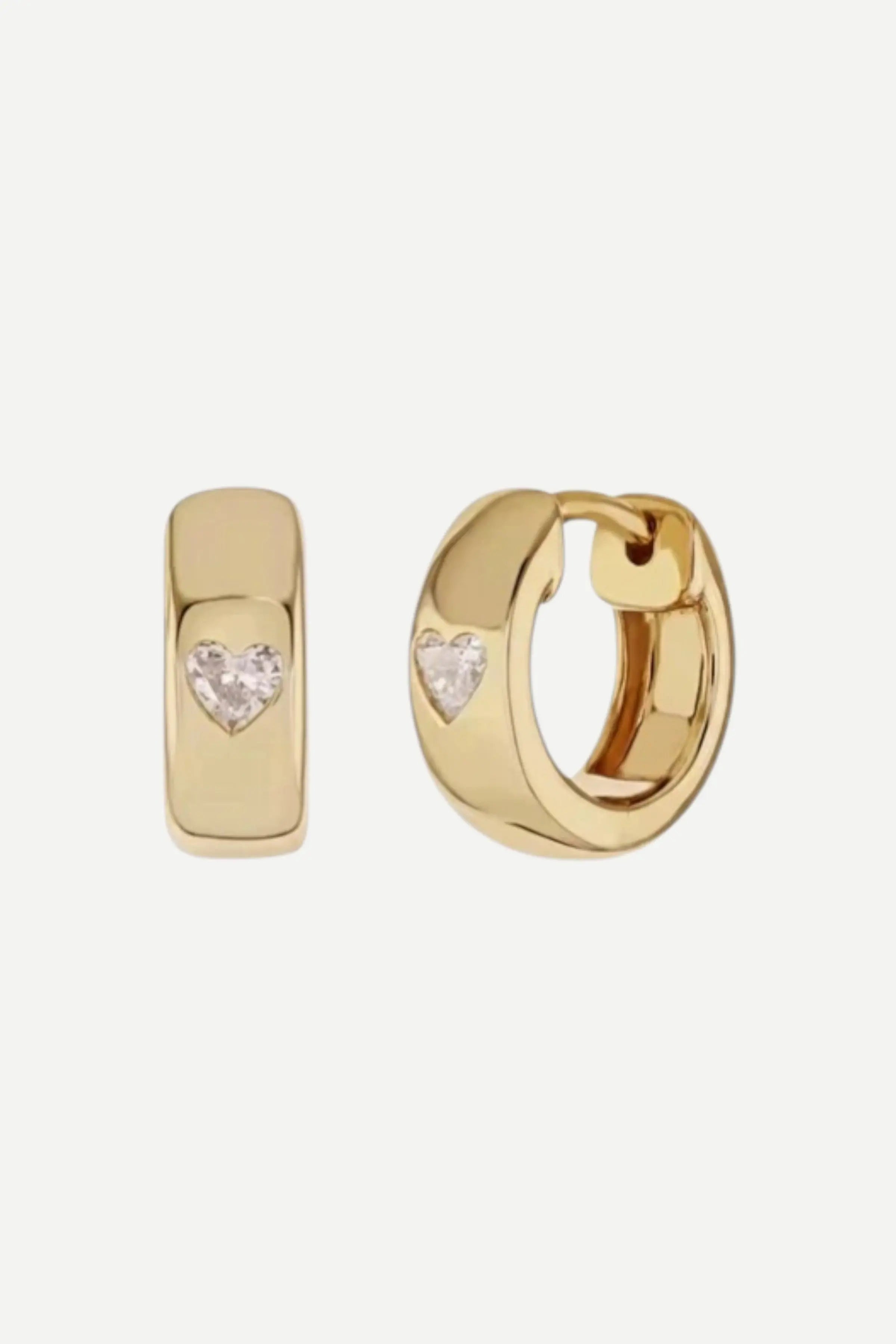 Our newest Wren Huggies style is adorned with a CZ heart diamond and heavily 14K Gold Plated over Sterling Silver.