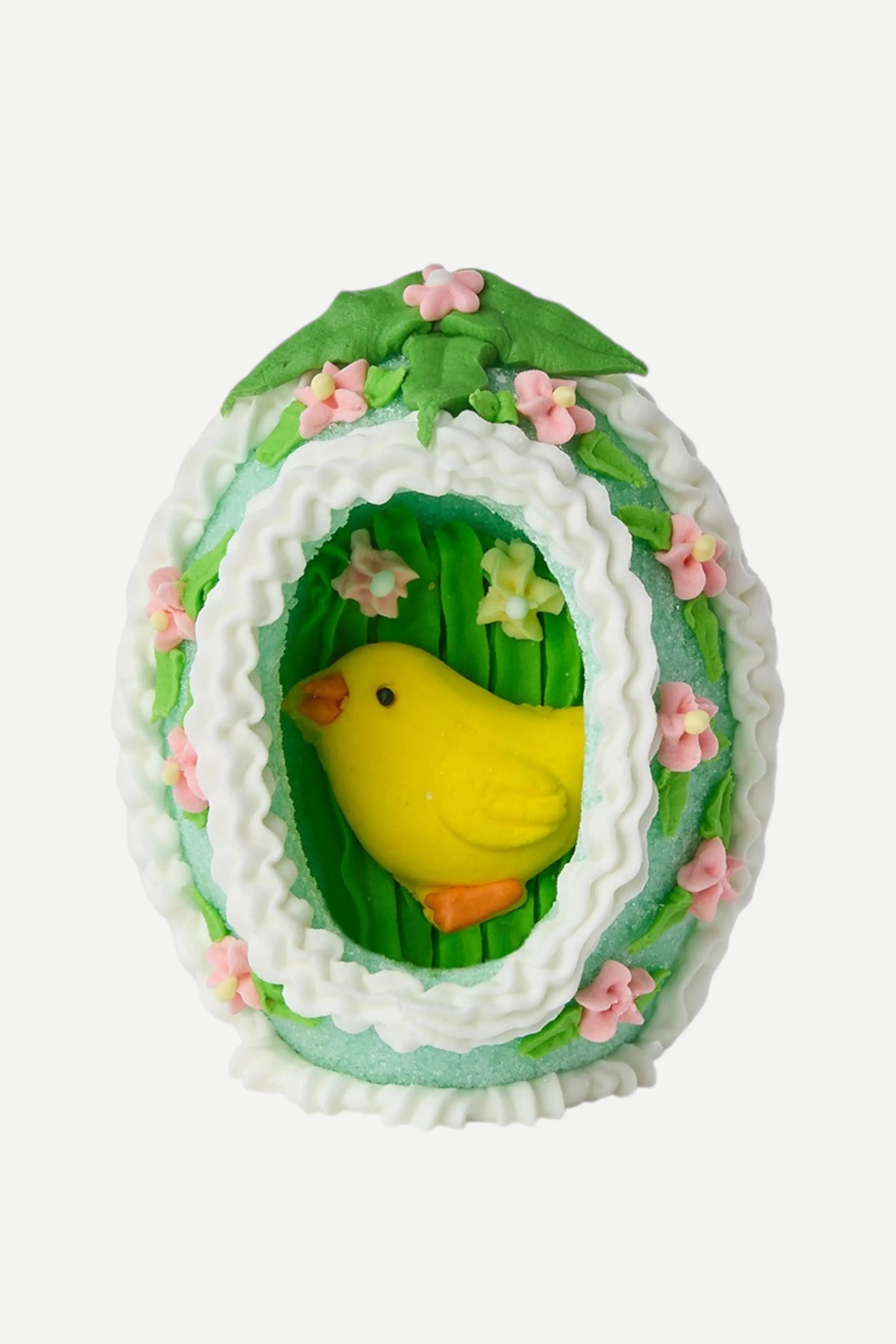 A nostalgic Easter tradition reimagined, these panoramic sugar eggs are delicately crafted keepsakes featuring tiny spring scenes tucked inside each colorful shell. Each egg showcases a classic pastel hue and an inner surprise-white with lamb, pink with duck, green with chick, and blue with bunny. Made from molded sugar with detailed accents, they bring a touch of vintage charm to Easter baskets, table displays, or seasonal gifting.