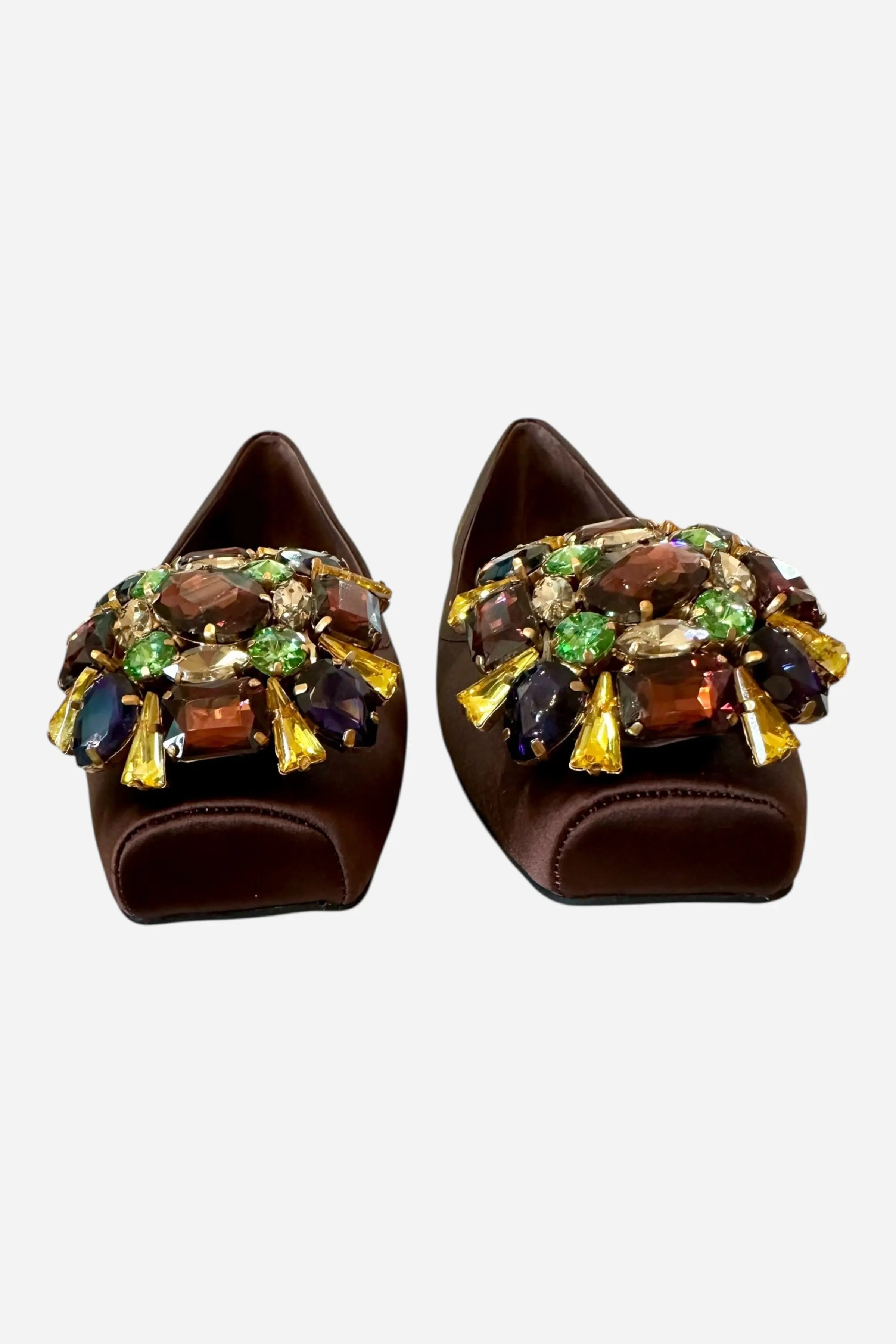 A true ballerina style with flat toe design. Ornate rhinestone embelishment so you can really show up this holiday!