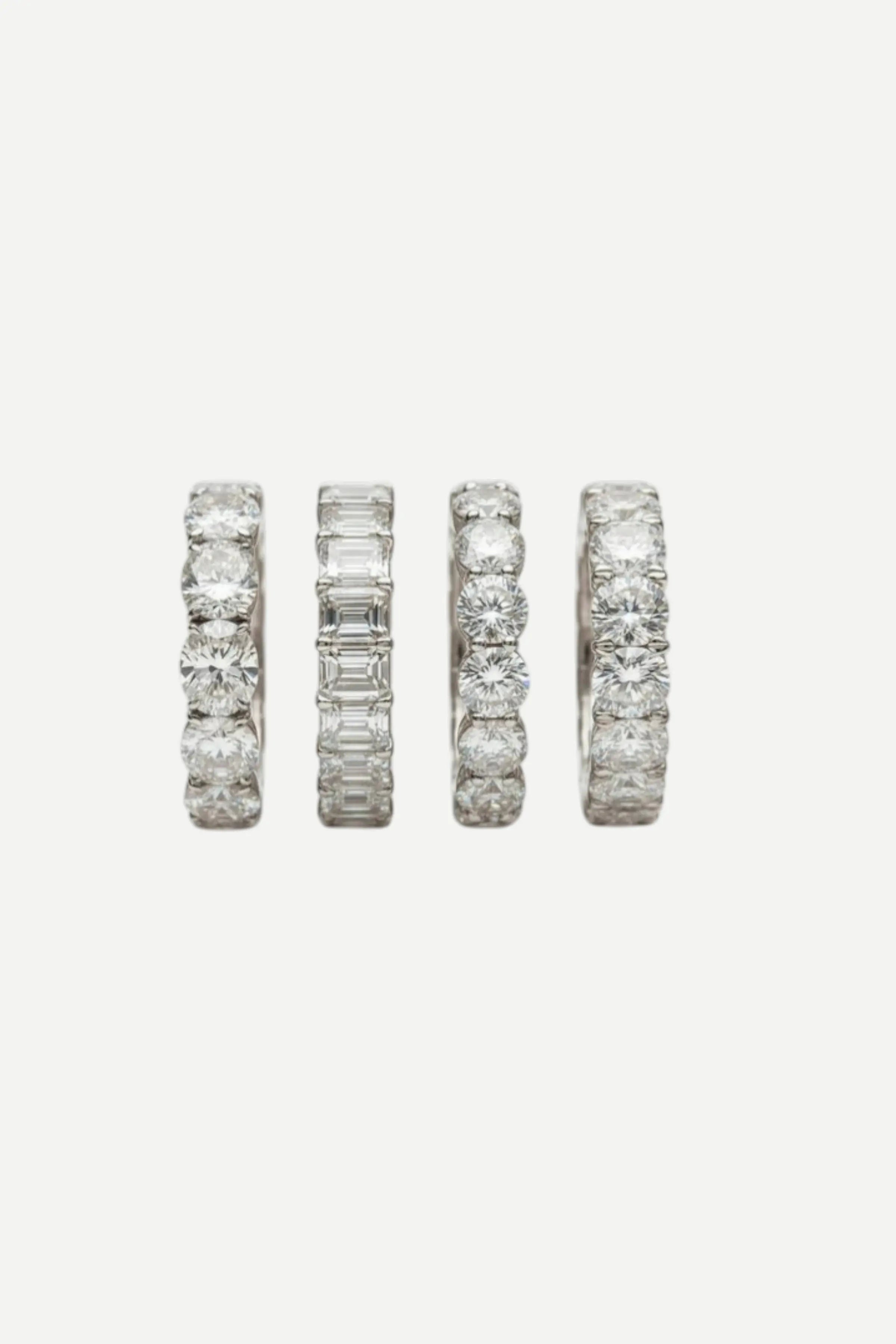 Our Eternity Bands are crafted from rhodium-plated sterling silver, providing both durability and a lustrous finish. We use the highest grade Cubic Zirconia stones for that extra sparkle. This band features a continuous line of stones designed to ensure a comfortable fit while maintaining a classic aesthetic suitable for various occasions.