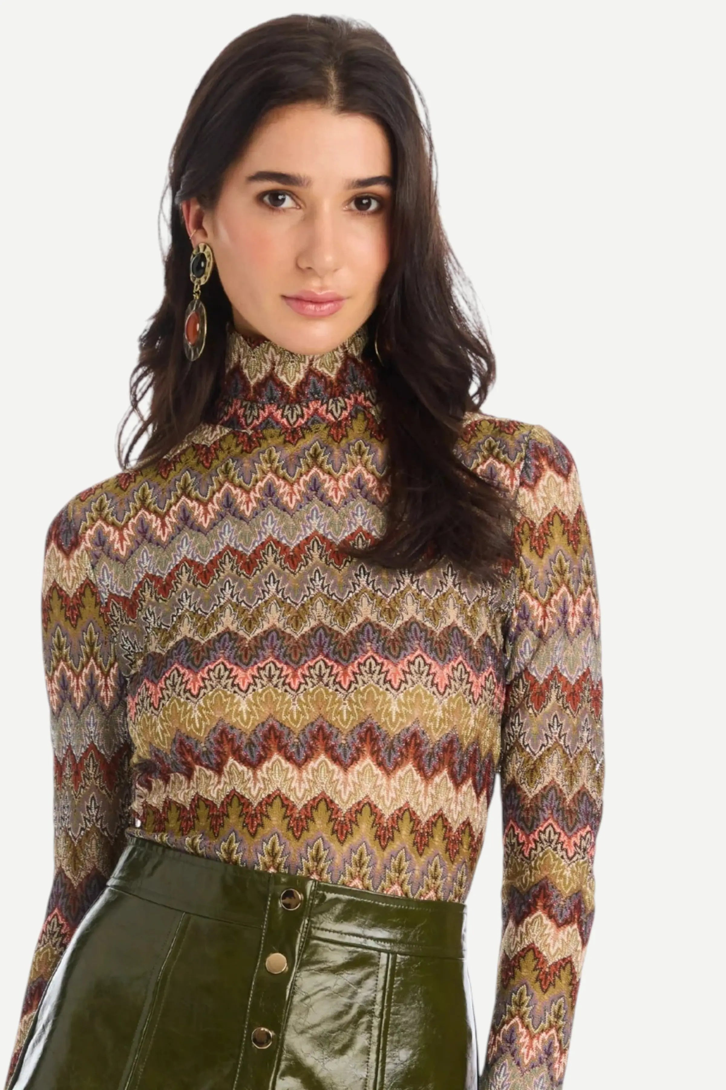 The Conner Top is cut in our chevron knit fabric featuring a high neckline and slim fit through the body and sleeves. Designed with a center back zipper and is unlined. Pair the Conner Top back to the matching Olive Skirt for a 70's-inspired set.