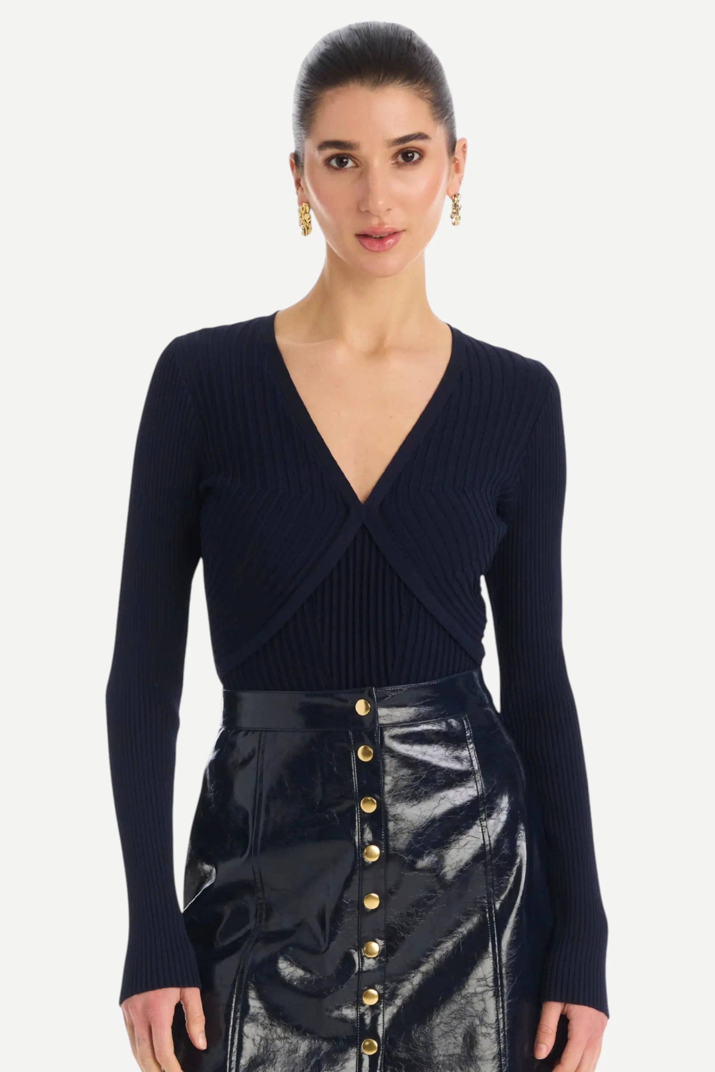The Haley Knit Top in a rich midnight navy hue features a slim fit through the body and sleeves in a lightweight viscose yarn, perfect for all year. Designed with a V neckline; perfect to tuck into the Carla mini skirt or your favorite denim.