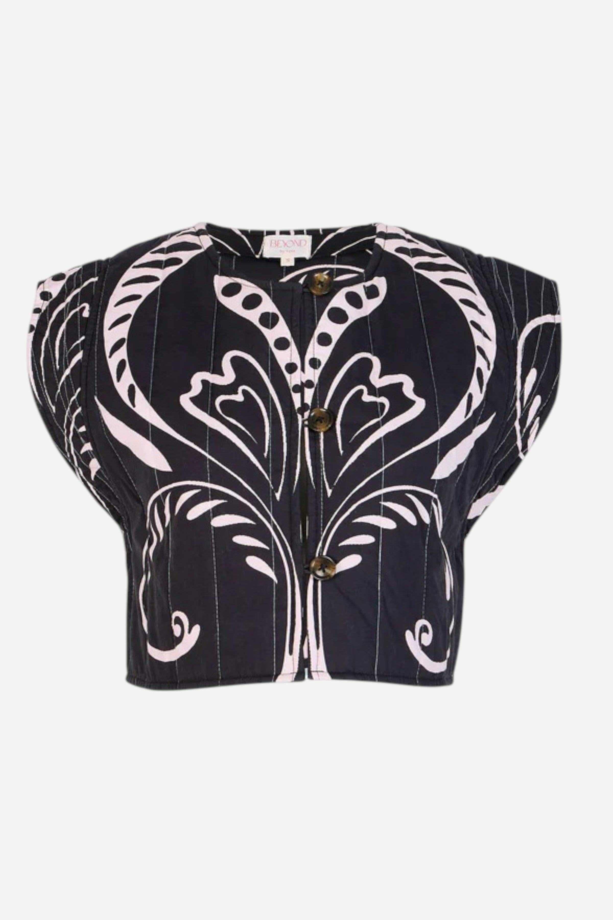 The Lexie vest is a modern take on layering, combining practicality with contemporary style. This quilted vest, cropped at the waist, features a button closure and subtle cap sleeves for a structured yet feminine silhouette. Pair it effortlessly with the Lennon skirt for a coordinated look or keep it casual with jeans for everyday ease. Lexie is crafted from crisp cotton poplin, breathable and soft against the skin. ‘Fountain’ is a print artwork that draws from the pure, revitalizing waters of a serene river, capturing that sense of renewal and tranquility.