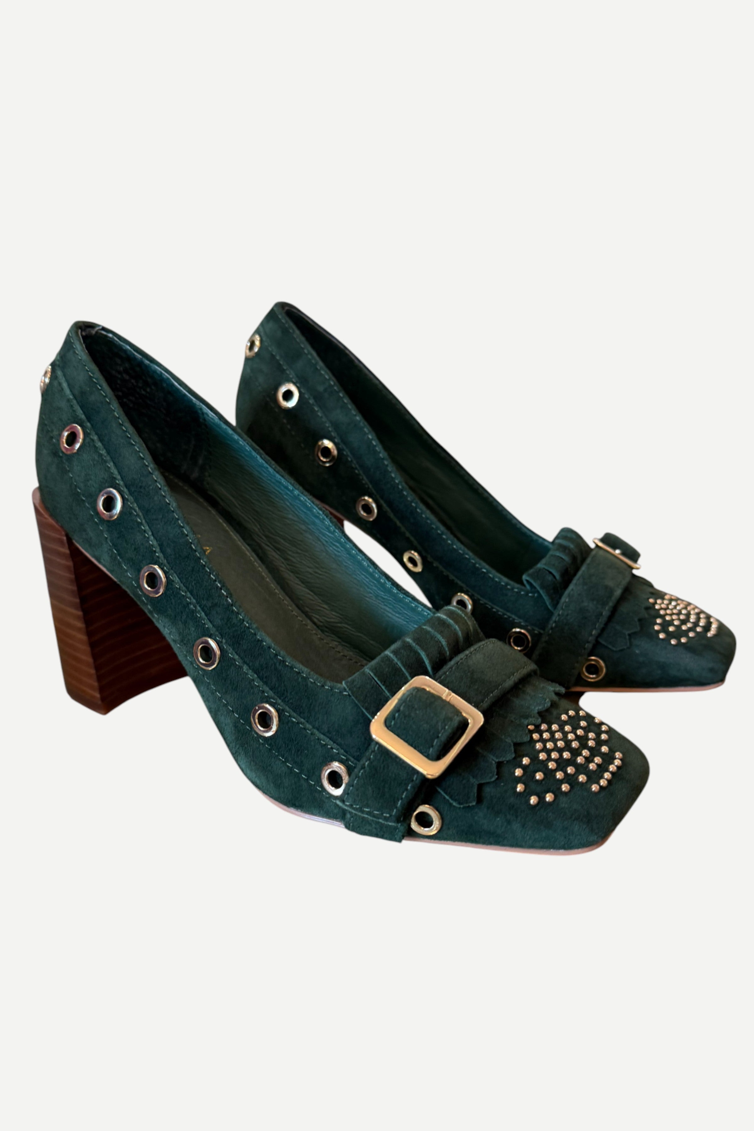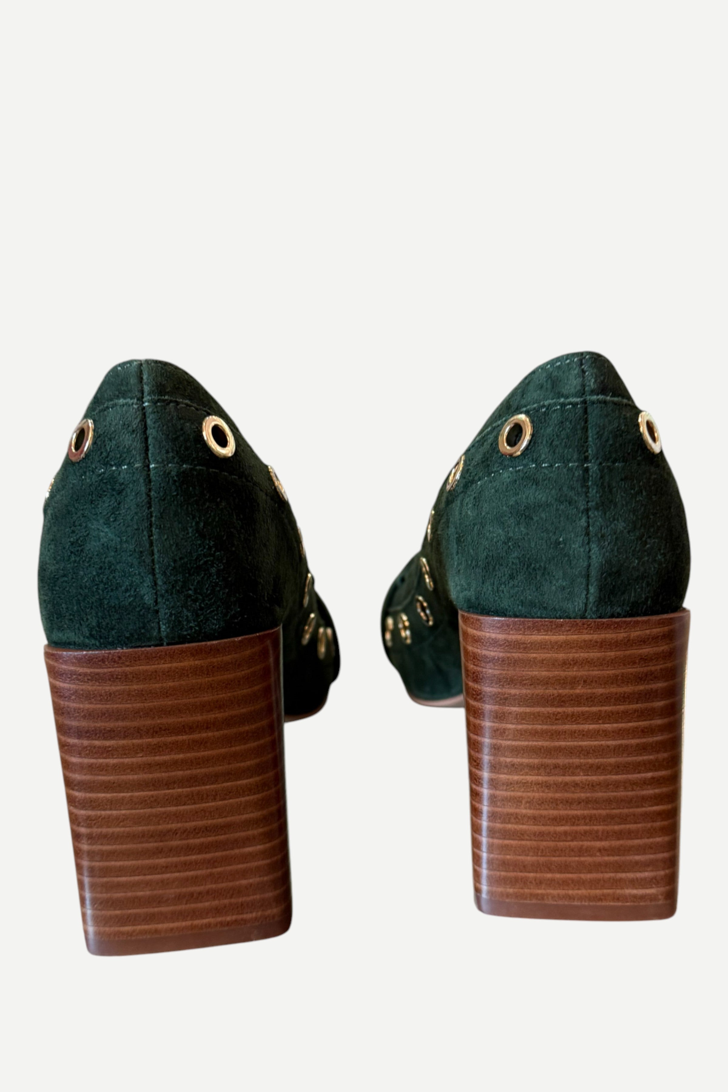 Block heel and a retro suede style.
