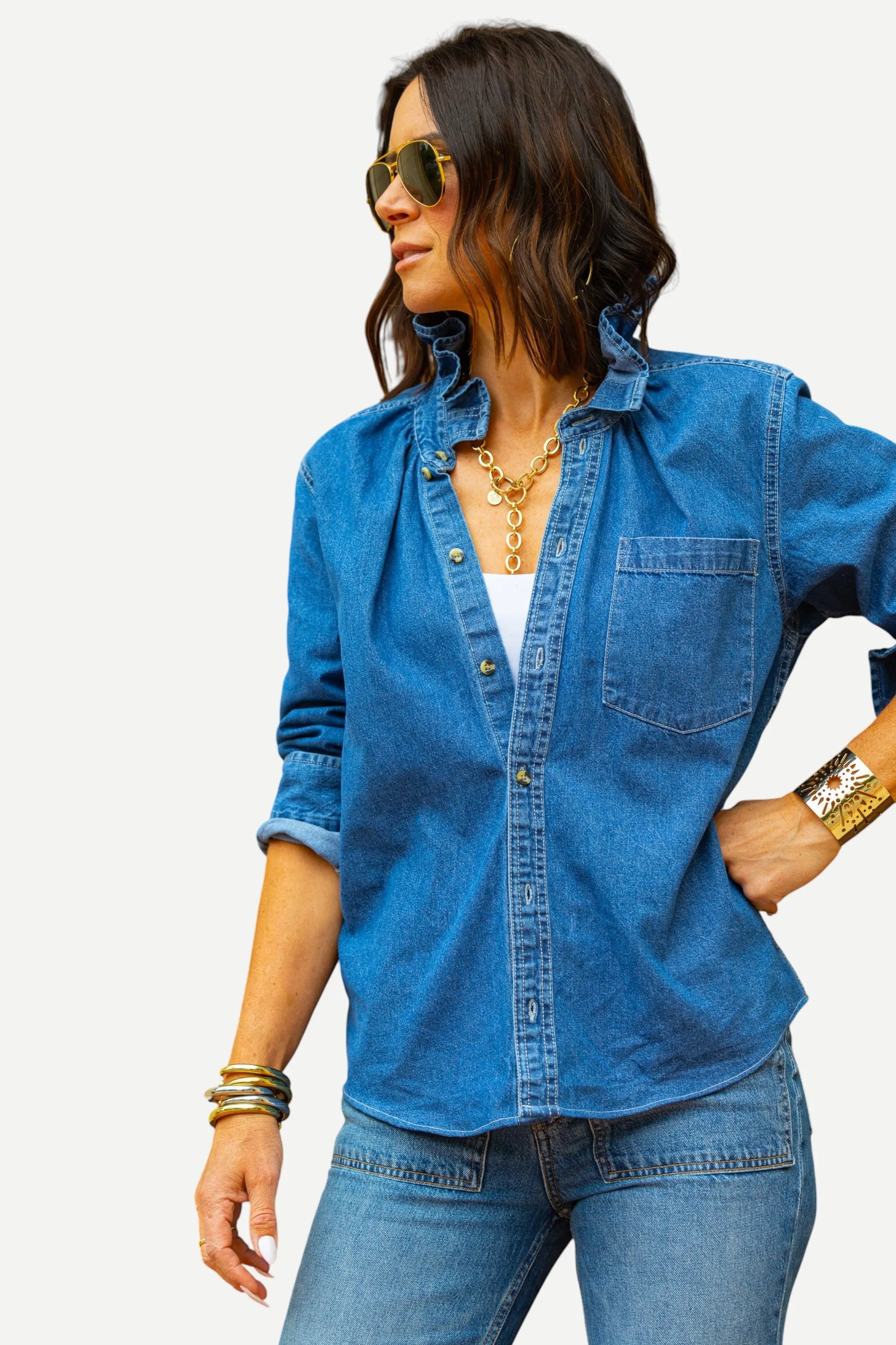 Our Quarantina Top offers the comfort of a boyfriend shirt with a touch of feminine flair, courtesy of our signature ruffle collar. Whether you opt to wear it buttoned down for a relaxed vibe, tied at the bottom for added flair, or tucked in for a polished look, Quarantina gives you the freedom to express your style with ease.