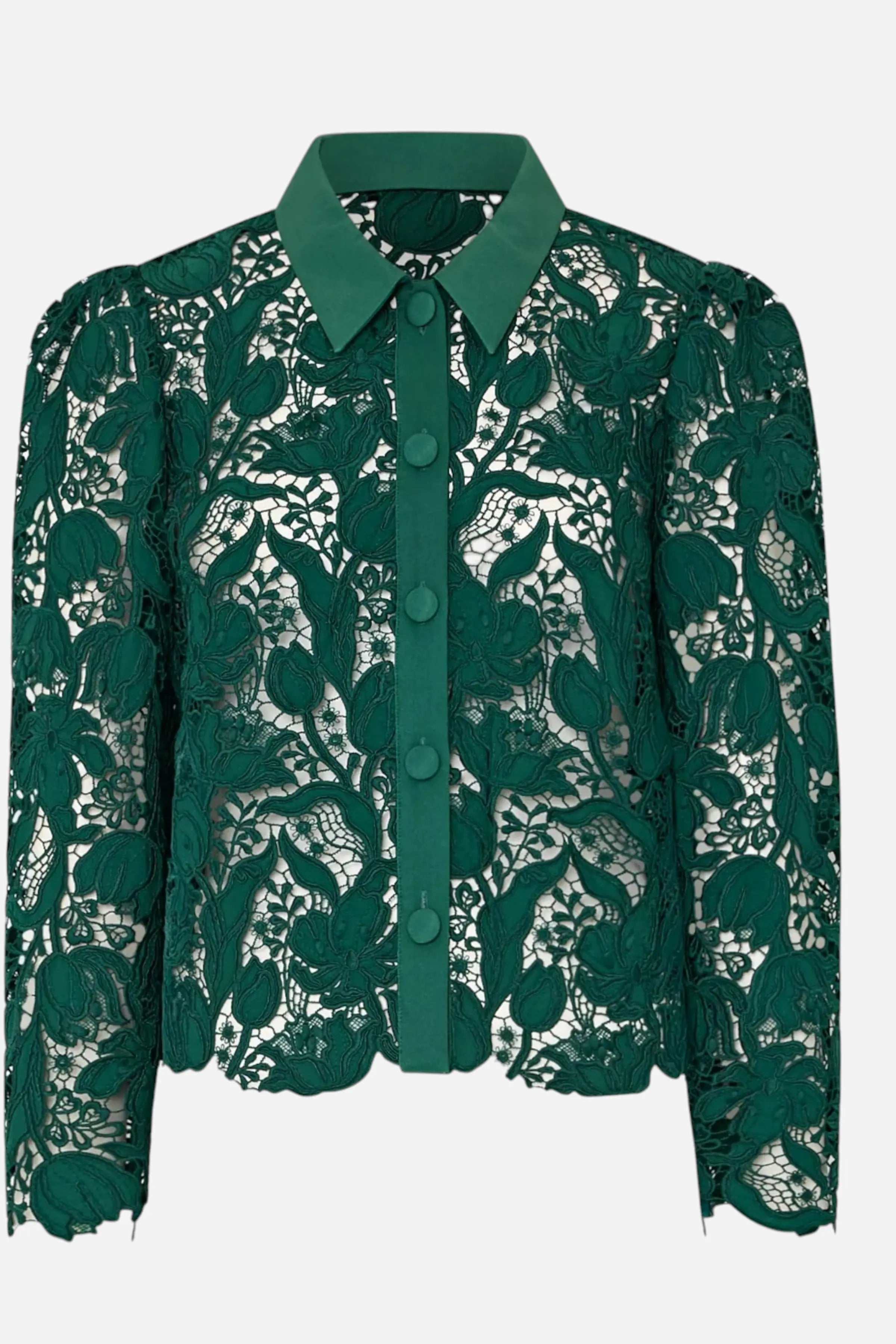 Rendered from stunning tulip garden embroidered lace, this long sleeved, collared blouse is the perfect way to dress up a simple wide leg pant or skirt. It buttons to close and is accented with zipper details at each sleeve cuff.
