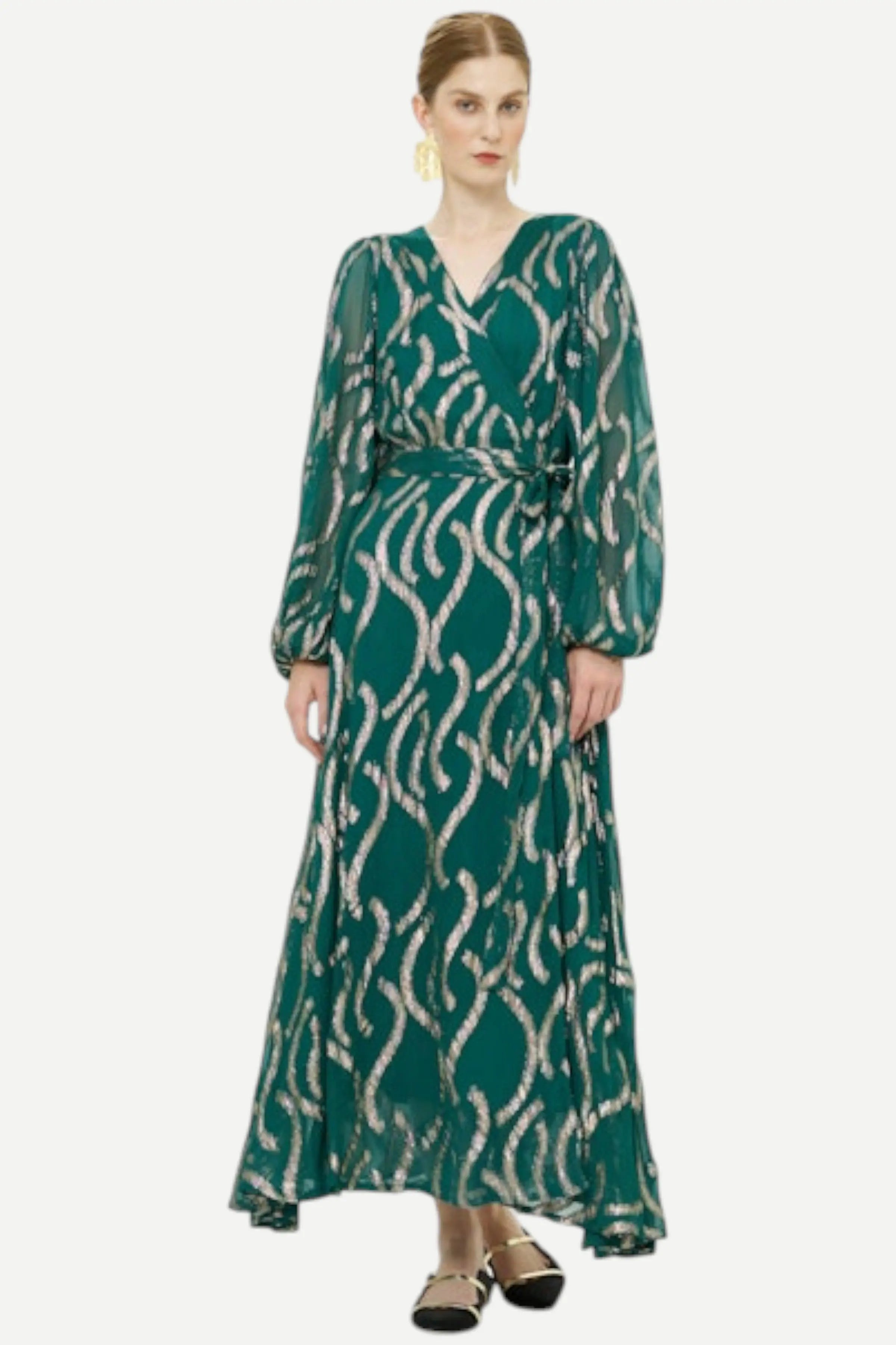 Gold lamé detailing throughout this gorgeous lined green wrap dress.