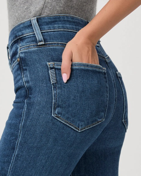 This high-rise, straight jean is lean through the leg and finishes at the ankle. Cut from our TRANSCEND VINTAGE denim in an aged dark wash with natural fading and German gold hardware, this style has the look of authentic vintage denim but is incredibly comfortable with plenty of stretch and recovery.